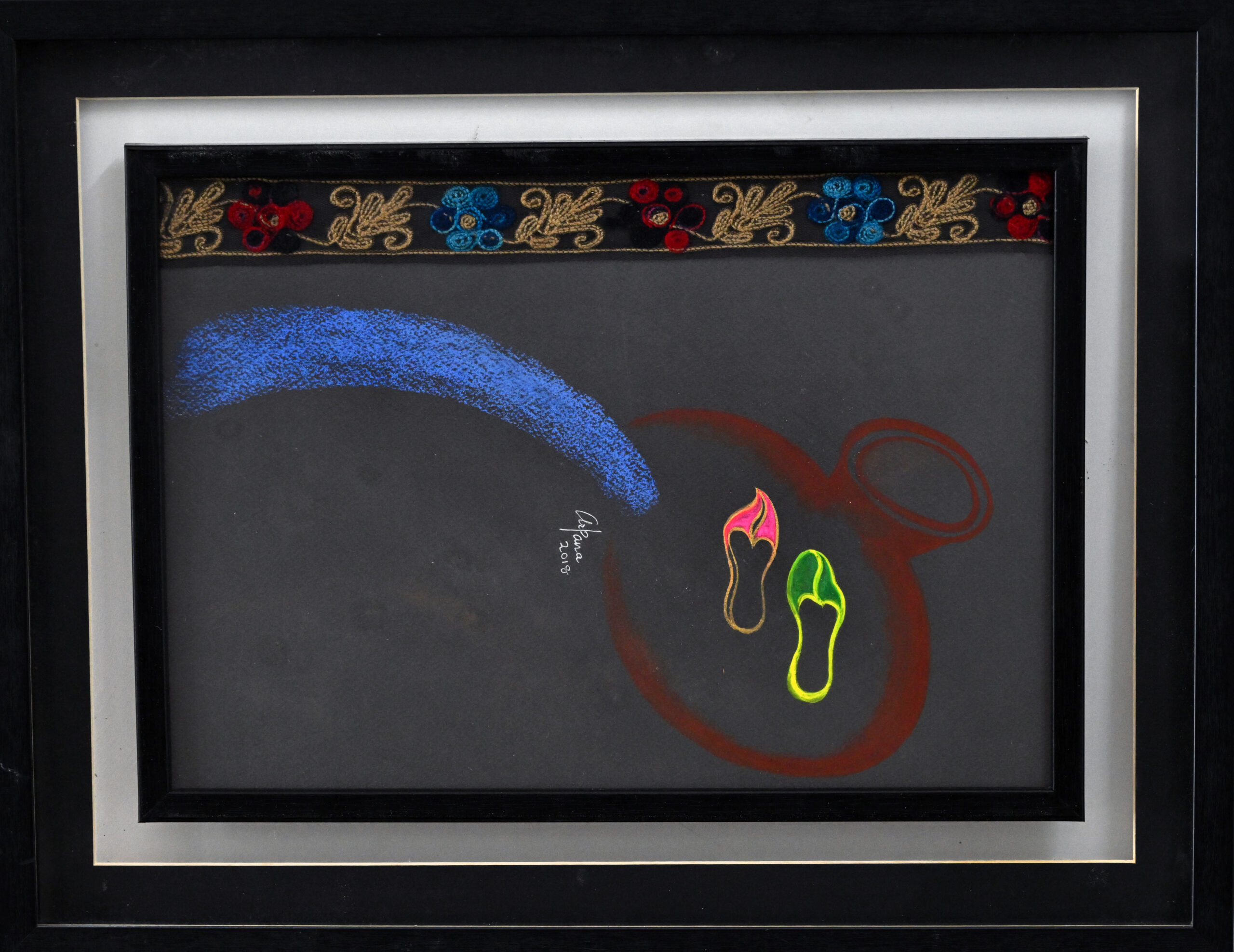 This minimalist artwork by Arpana Caur features two stylized footprints—one pink and black, the other green and yellow—nestled within or beside a red circular form resembling a vessel. A sweeping blue brushstroke arcs across the canvas, introducing movement and a sense of spiritual flow. Above, an embroidered floral strip in red, blue, and gold adds a touch of tradition and textile richness to the otherwise abstract composition. Through its symbolic elements and vibrant palette, the piece evokes themes of journey, identity, and cultural continuity.