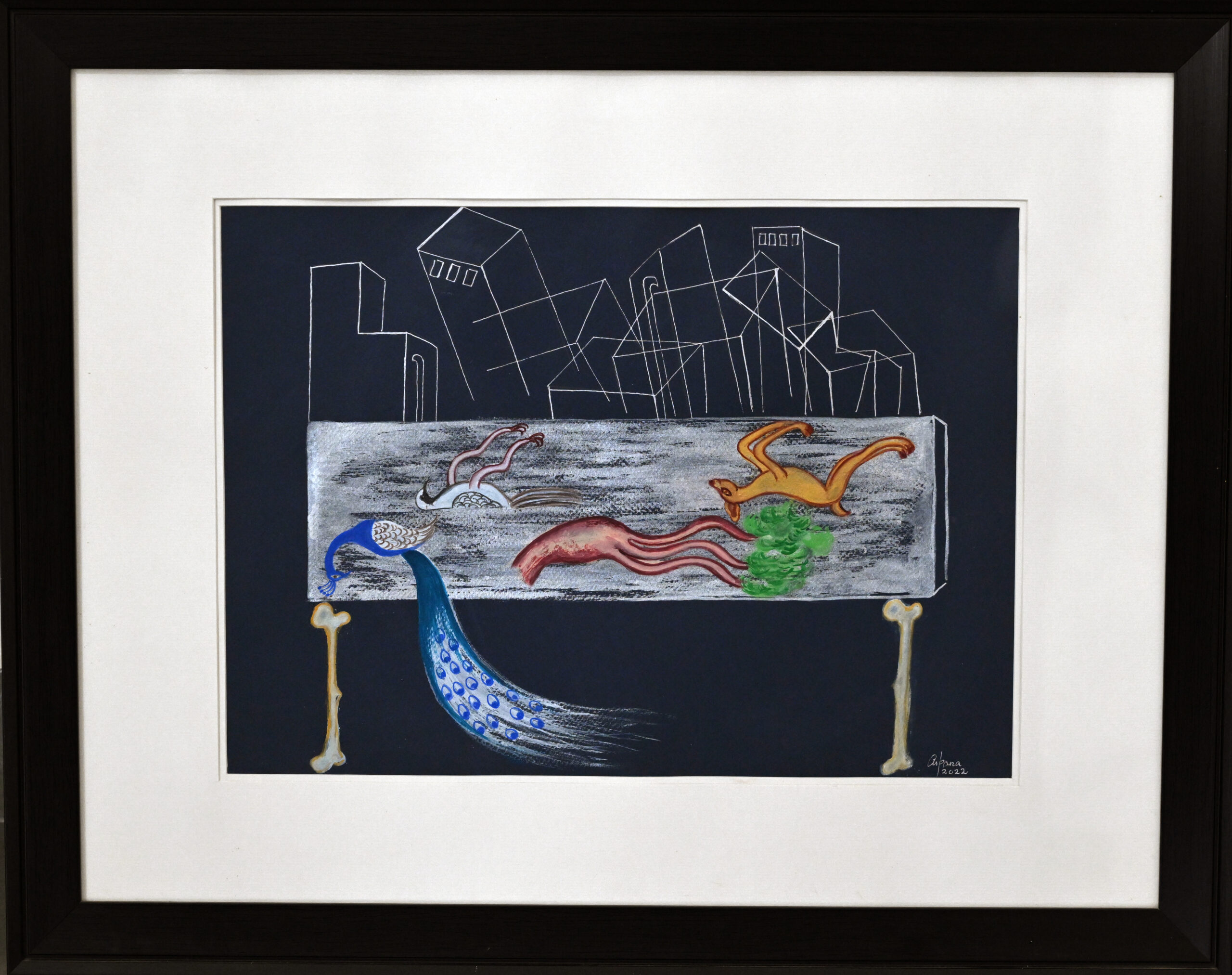 This surreal artwork by Arpana Caur features a central platform supported by bone-like structures, carrying a procession of stylized, elongated animal figures in vibrant hues—blue, red, orange, and green. A peacock with a flowing tail leads the group, evoking motion and symbolic grace amid the abstract setting. Behind them, white line drawings of overlapping urban structures create a layered backdrop, blending fantasy with architectural abstraction. Through its dreamlike composition and symbolic contrasts, the piece explores themes of migration, memory, and the coexistence of nature and urban life.