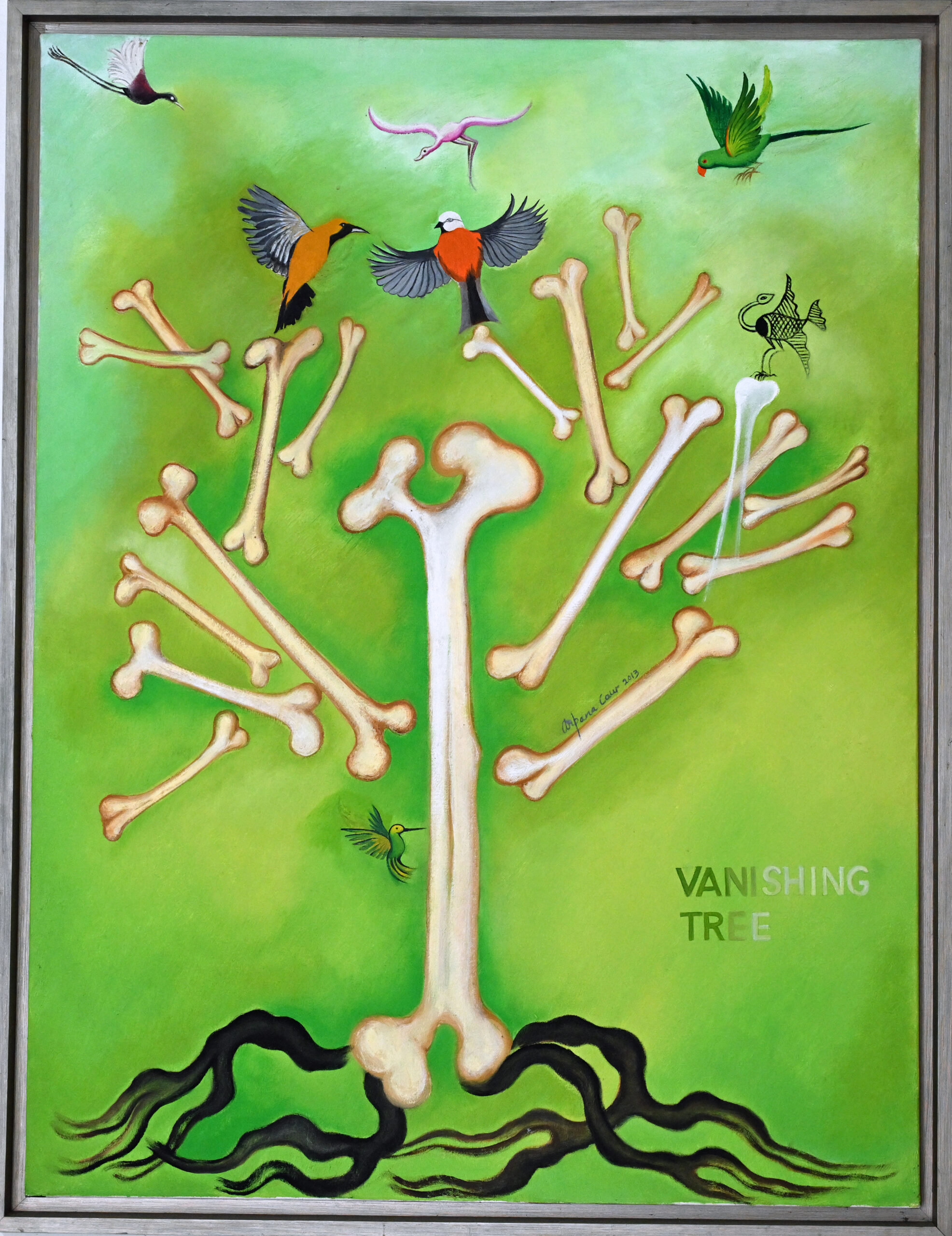 This surreal artwork by Arpana Caur, titled Vanishing Tree, presents a haunting vision of a tree composed entirely of human bones, with a femur forming the trunk and skeletal branches reaching outward. Birds perch and flutter around the bone-laden limbs, creating a poignant contrast between life and death. The gnarled black roots and green gradient background evoke decay within a natural setting, underscoring themes of extinction and fragility. Through its stark symbolism and evocative composition, the piece explores the intersection of mortality, memory, and environmental loss.