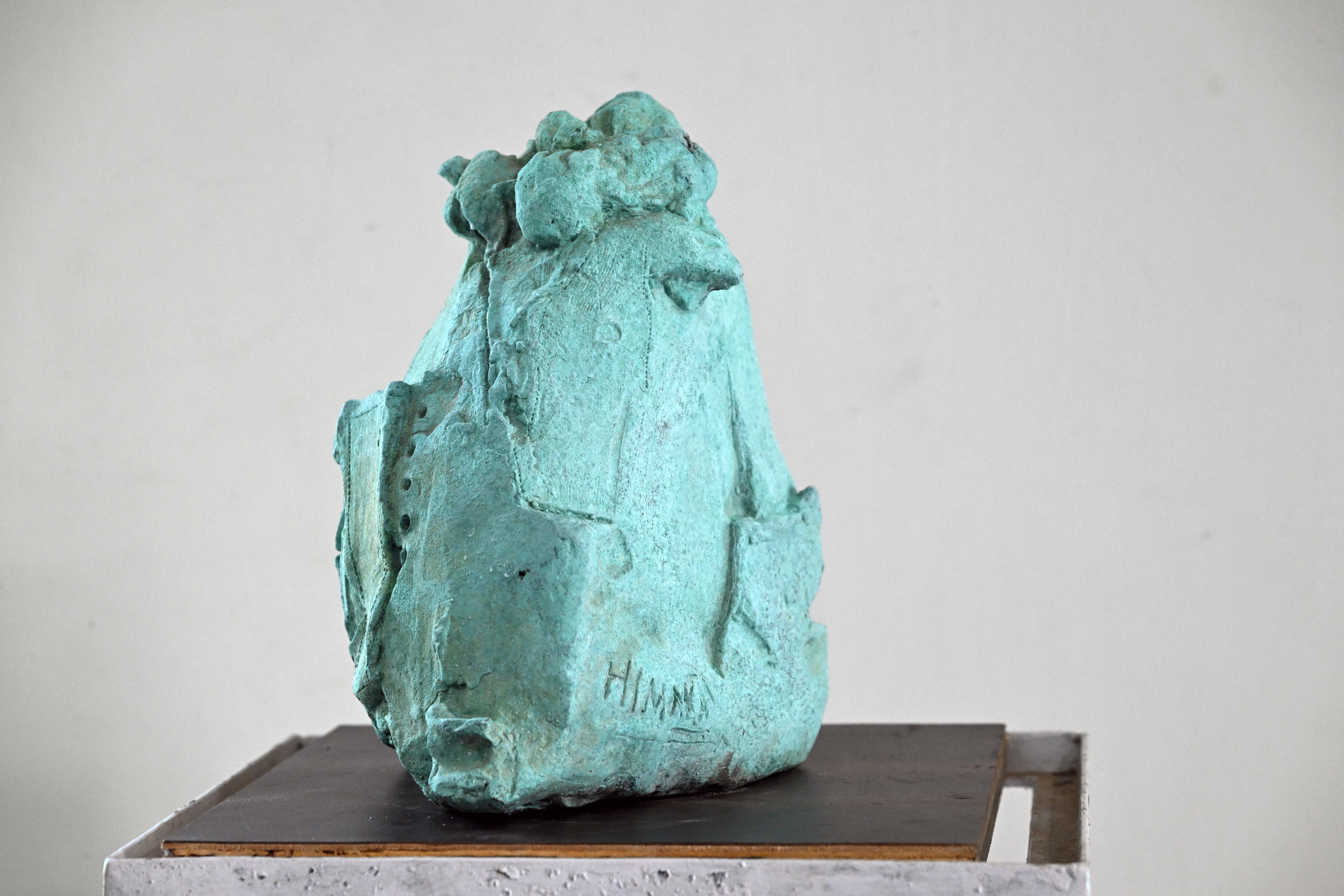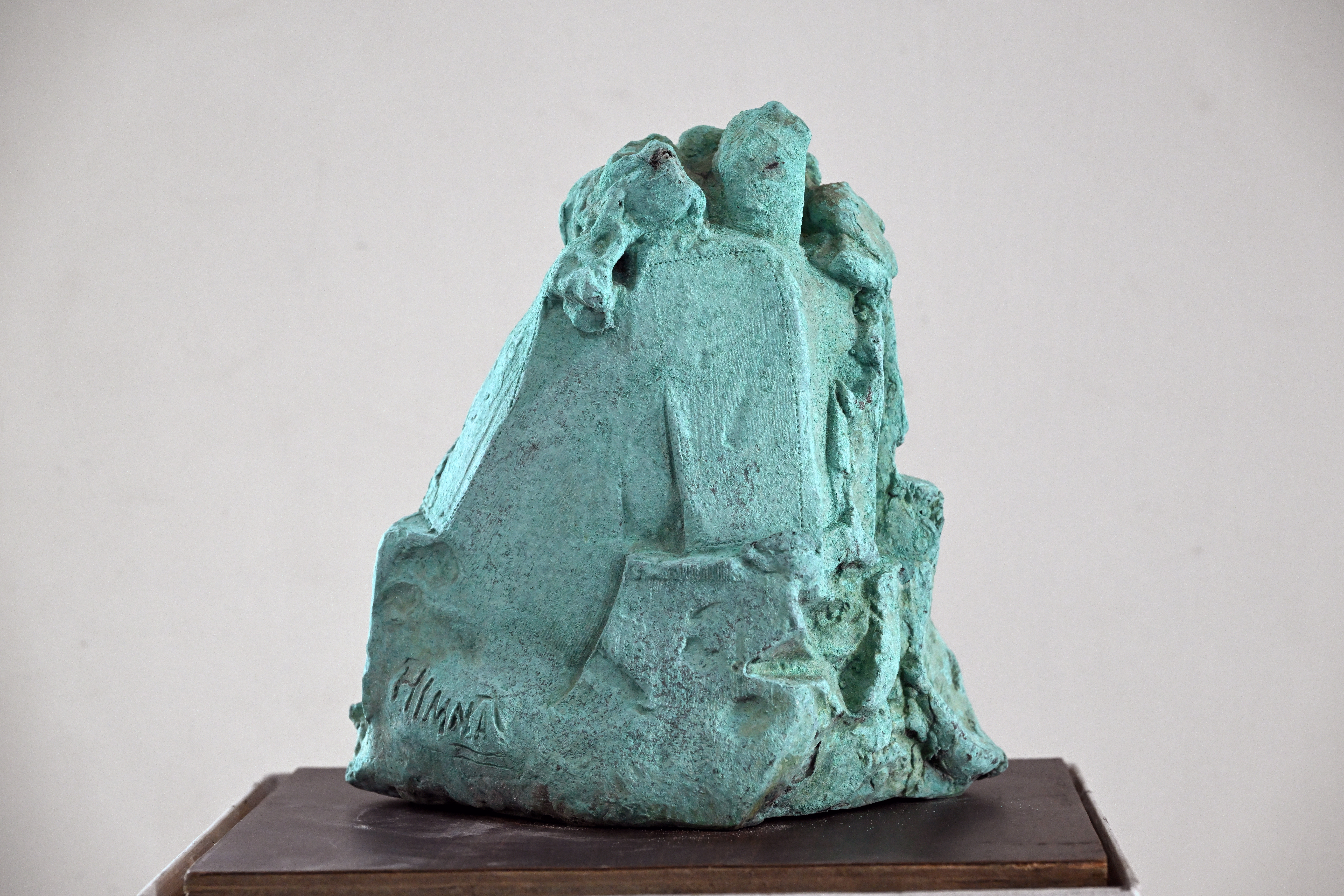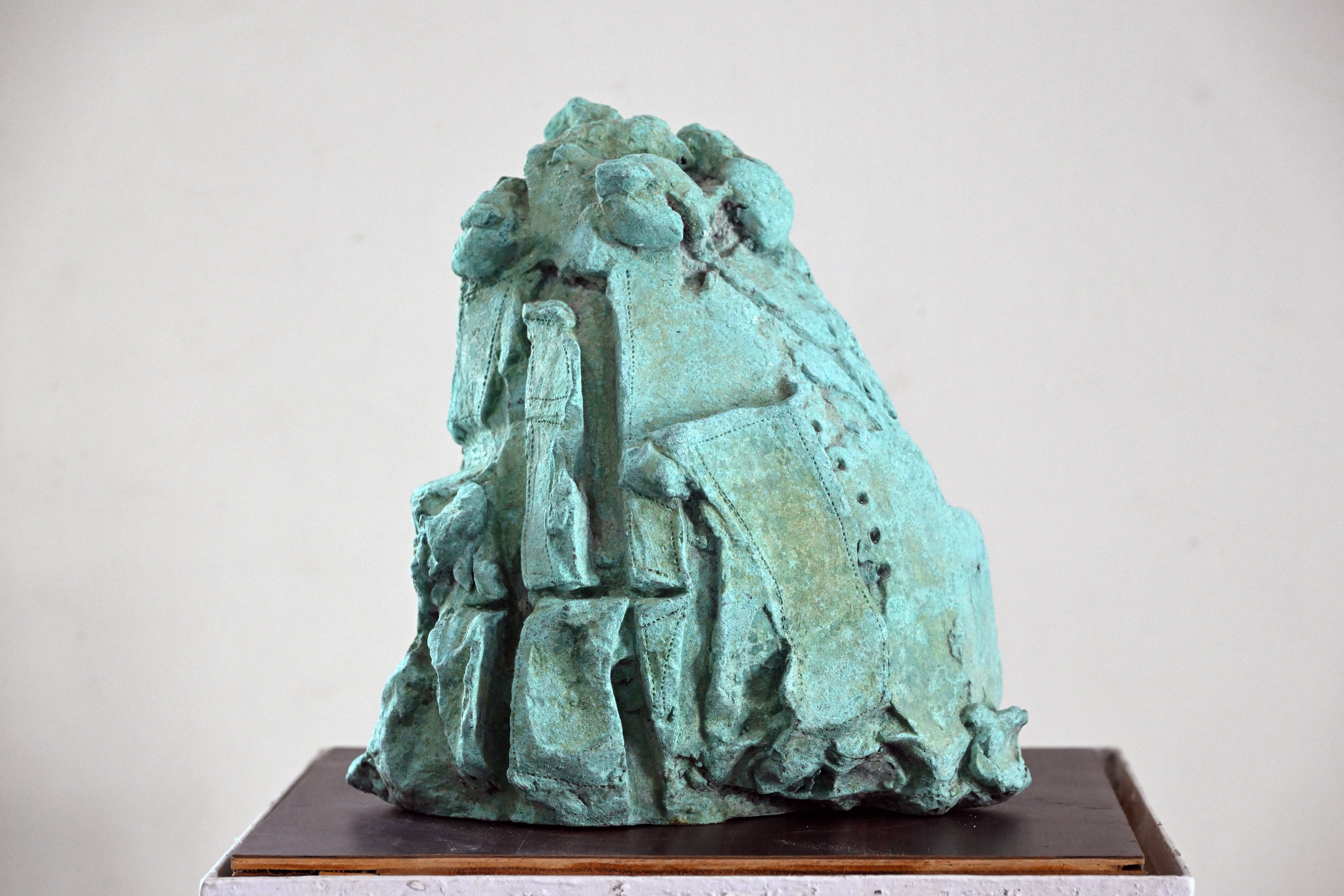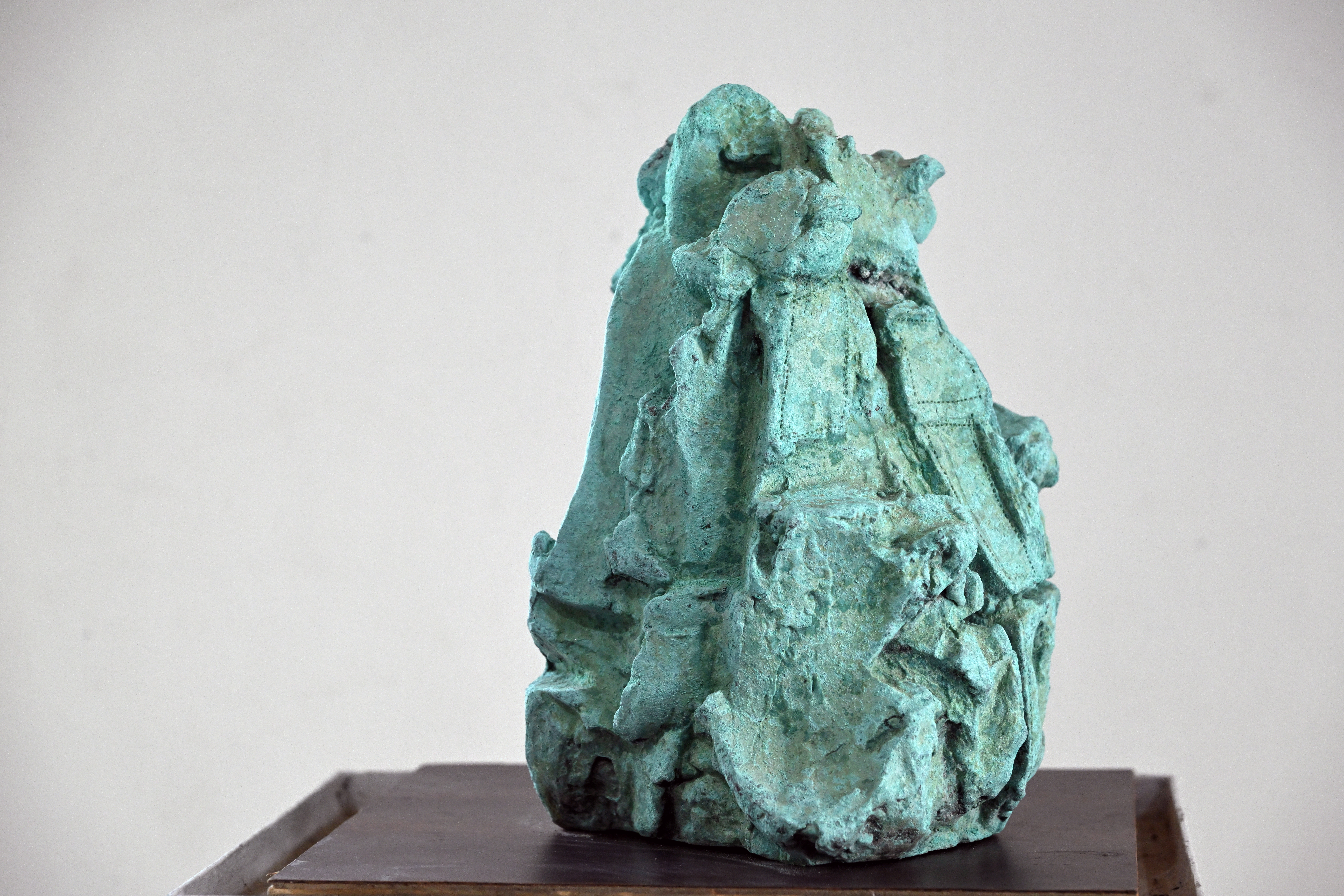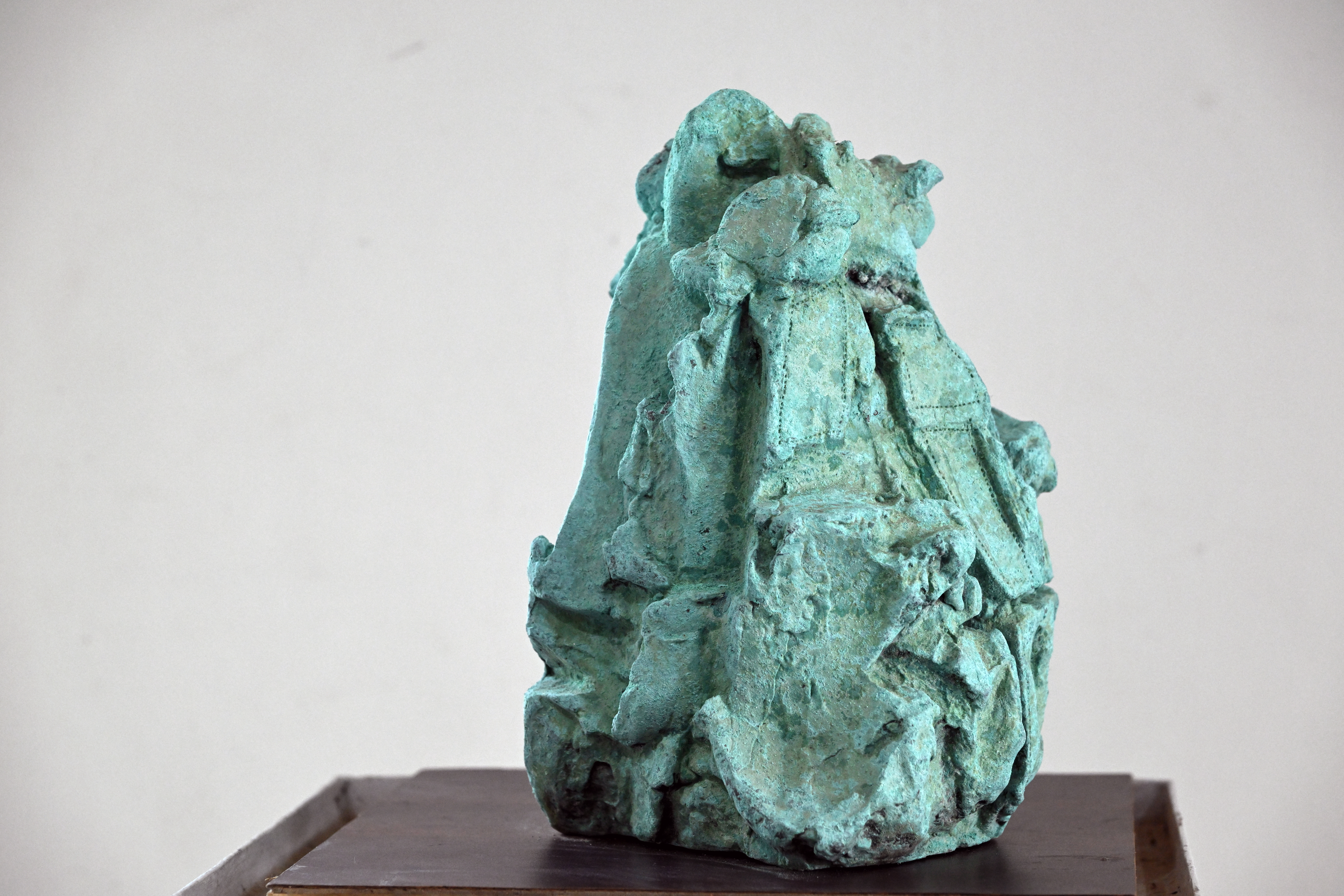 This abstract sculpture by Himmat Shah features a rugged, organic form with folds, creases, and protrusions that evoke natural terrain or bodily contours. Cast in a turquoise patina, the surface is richly textured, enhancing its tactile and expressive quality. The irregular shape resists symmetry, inviting viewers to interpret its emotional and spatial presence. Through its raw materiality and contemplative form, the piece reflects Shah’s modernist sensibility and his deep engagement with texture, abstraction, and the essence of sculptural language.