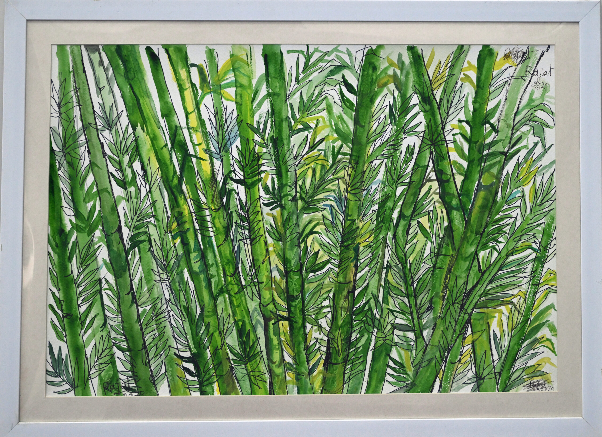 Rajat Ghosh’s bamboo forest breathes with quiet vitality—each stalk a pillar of resilience, each leaf a whisper of grace. The interplay of dark and light greens creates a rhythmic density, like nature’s own calligraphy etched in watercolor. Interwoven leaves form a lattice of movement, suggesting both shelter and wildness in their tangled dance. This lush…