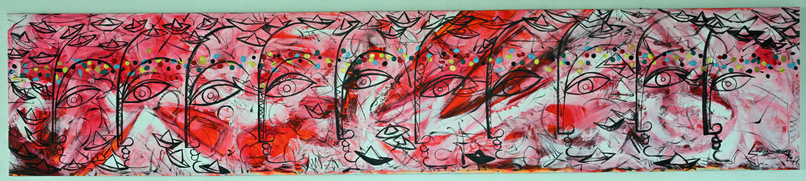 This expressive artwork by Sachindranath Jha features stylized human faces with bold eyes, emerging from a vibrant sea of red, pink, and white brushstrokes. The dynamic background conveys emotional intensity and movement, while scattered colorful dots add texture and rhythm. Black boat-like motifs float above and below the faces, suggesting themes of journey, transition, or collective experience. Blending abstract expressionism with symbolic imagery, the piece invites reflection on identity, emotion, and the fluidity of human connection.