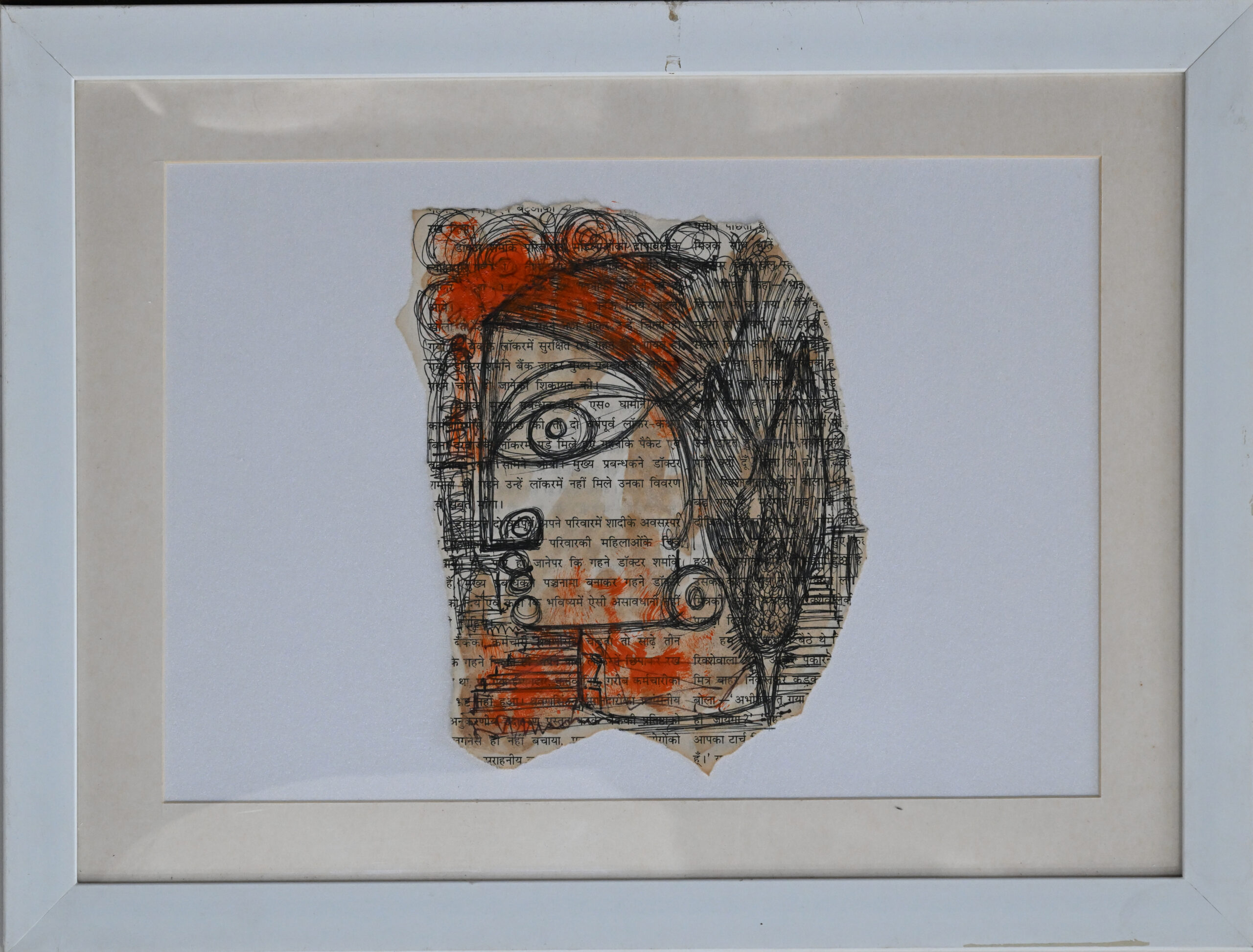 A face emerges from torn text, its bold black lines and orange accents burning through printed silence. The gaze is abstract yet intimate, as if memory were sketched onto forgotten pages. Each stroke feels urgent, each fragment of script a whisper of context lost and reclaimed. Sachindranath Jha’s mixed media portrait becomes a meditation on identity—layered, raw, and defiantly expressive.