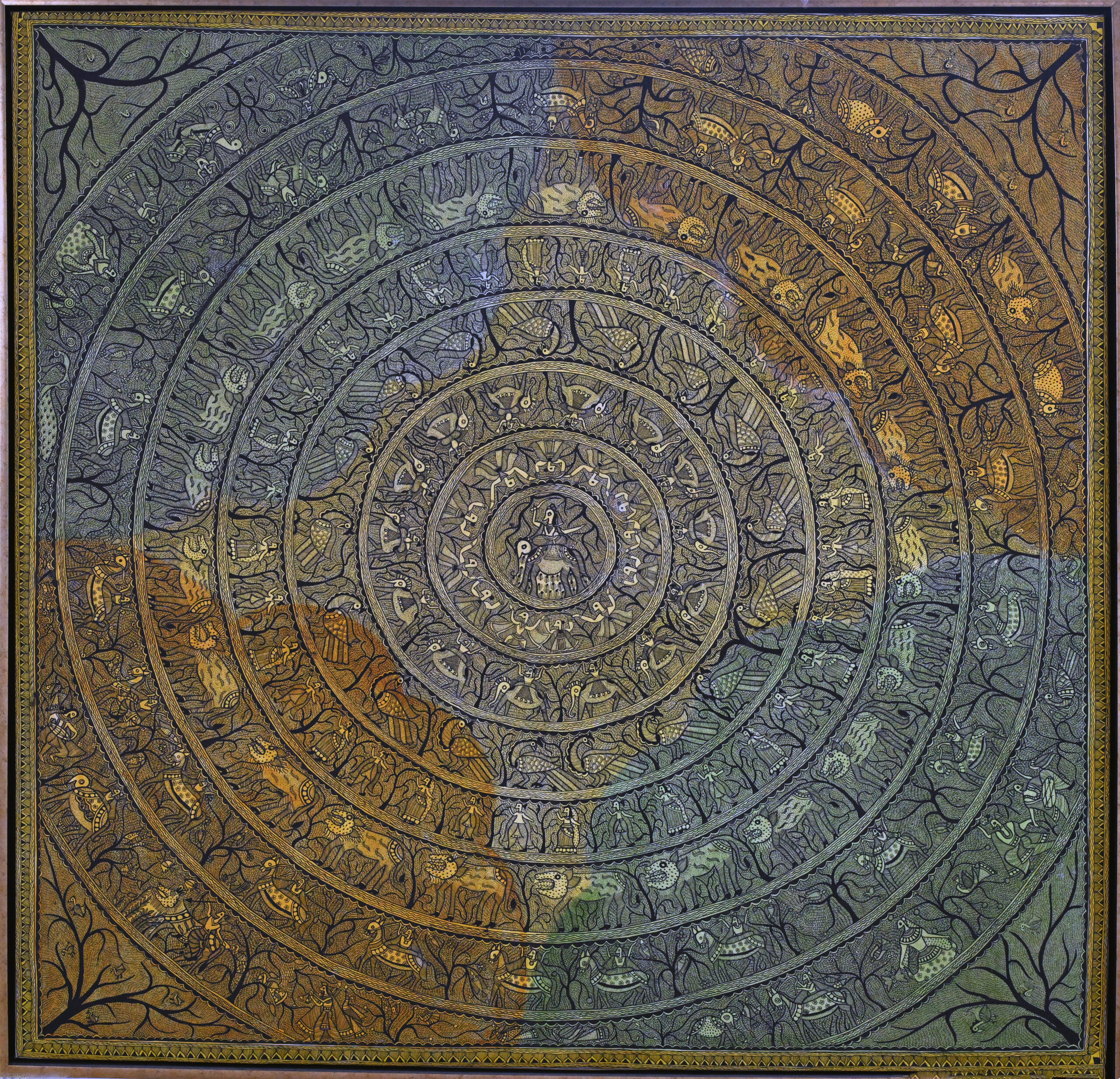 The mandala is divided into four vibrant quadrants—green, blue, yellow, and orange—each radiating spiritual energy through concentric circles and deity-like figures. Siwan Paswan’s style blends ritualistic symbolism with social commentary, using repetitive motifs and tree-like borders to evoke themes of nature, divinity, and resistance. The central figure anchors the composition, while the symmetrical layout reflects…