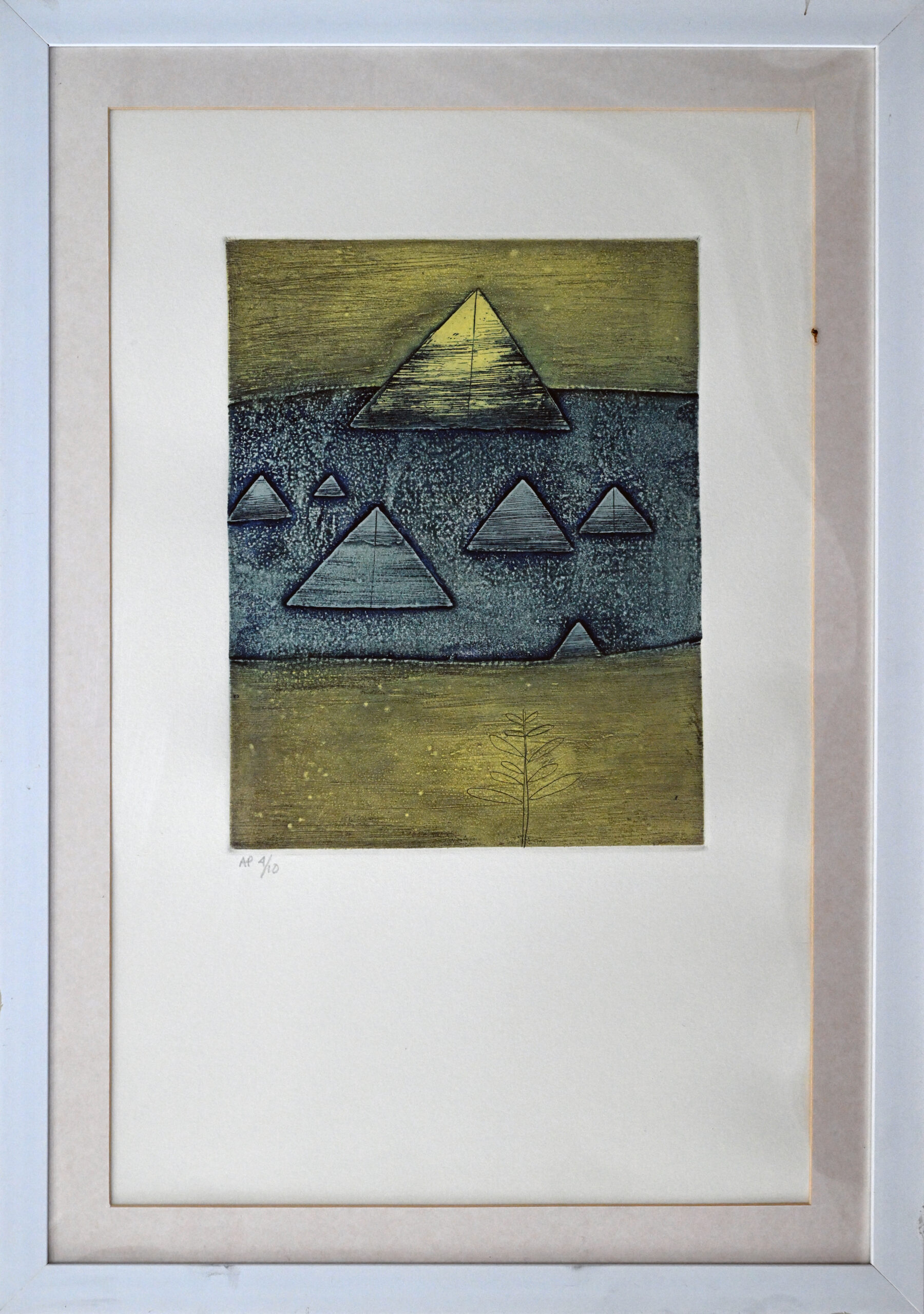A procession of pyramids floats across a textured twilight, their forms shifting between solidity and shadow. The central band, dark and grainy, feels like a veil—part cosmic terrain, part subconscious passage. Above and below, green fields hum with quiet tension, framing the geometry like a ritual in motion. Suhas Roy distills mysticism into abstraction, where each triangle becomes a silent chant in the landscape’s breath.