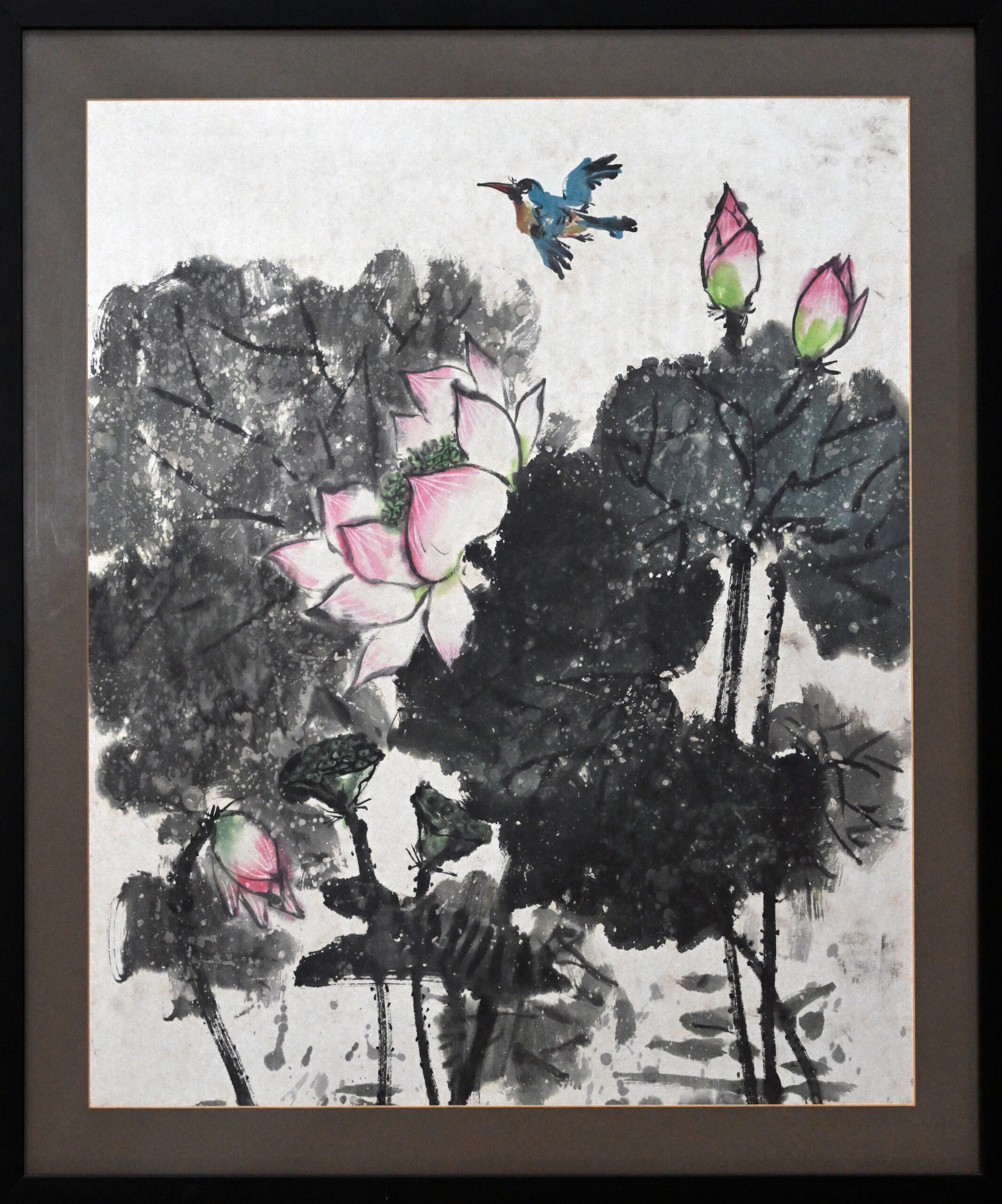 This delicate ink and watercolor painting by Sunil Vishwakarma captures the serene elegance of lotus blossoms in various stages of bloom, their soft pink petals framed by sweeping, dark leaves. A vibrant bird with blue and orange plumage hovers above, adding a sense of motion and vitality to the tranquil scene. The minimal background allows the natural forms to breathe, emphasizing harmony and balance in composition. Vishwakarma’s brushwork blends traditional Chinese aesthetics with lyrical sensitivity, celebrating the quiet beauty of flora and fauna in poetic stillness.
