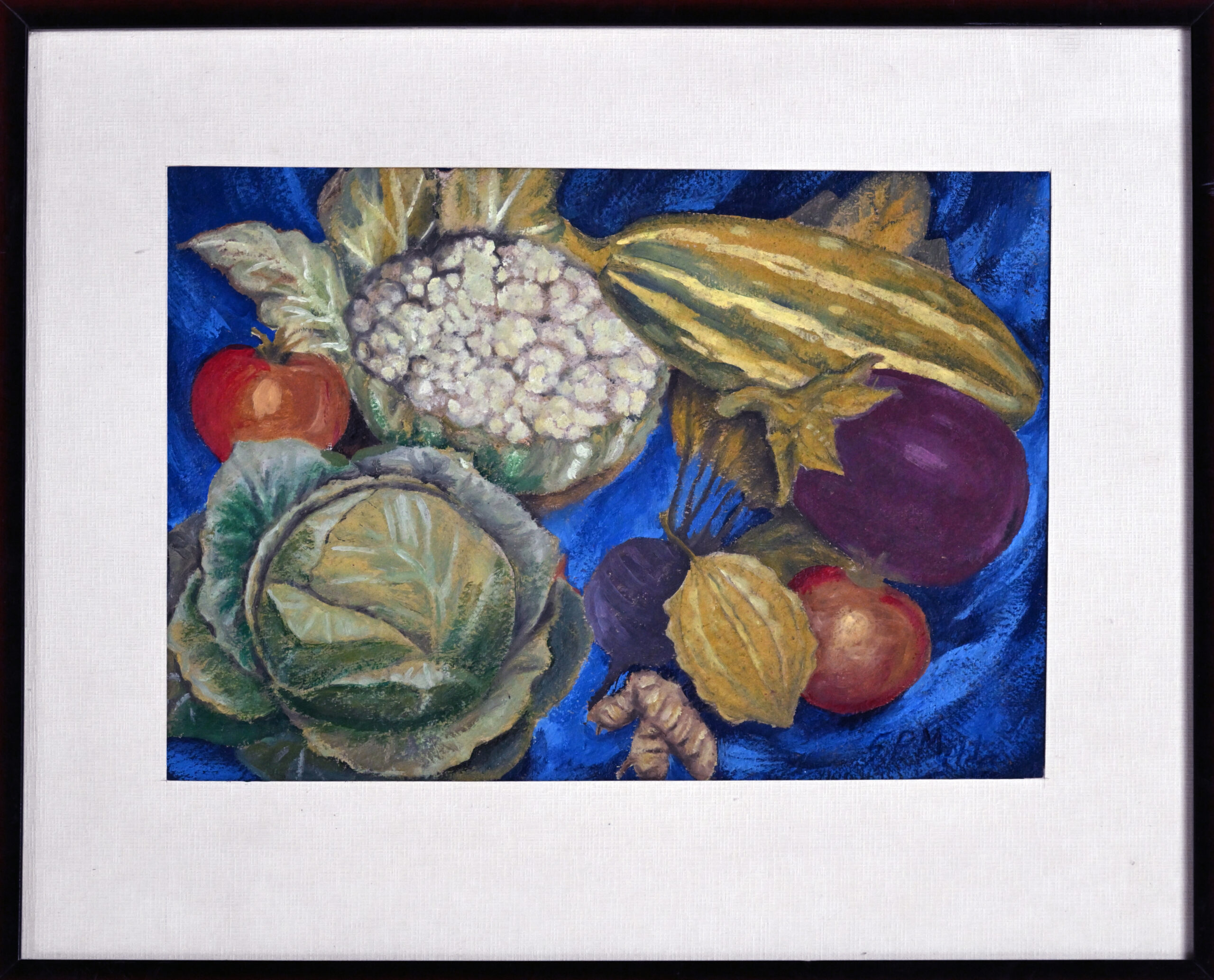 This vibrant still-life painting showcases a rich assortment of fruits and vegetables arranged against a deep blue background, creating a striking visual contrast. Each item—from the textured cabbage and cauliflower to the glossy eggplant and striped squash—is rendered with meticulous detail and lifelike color. The harmonious composition celebrates the natural beauty and diversity of produce, inviting appreciation for everyday nourishment. Through its realistic style and bold palette, the artwork evokes abundance, vitality, and the quiet elegance of organic forms.