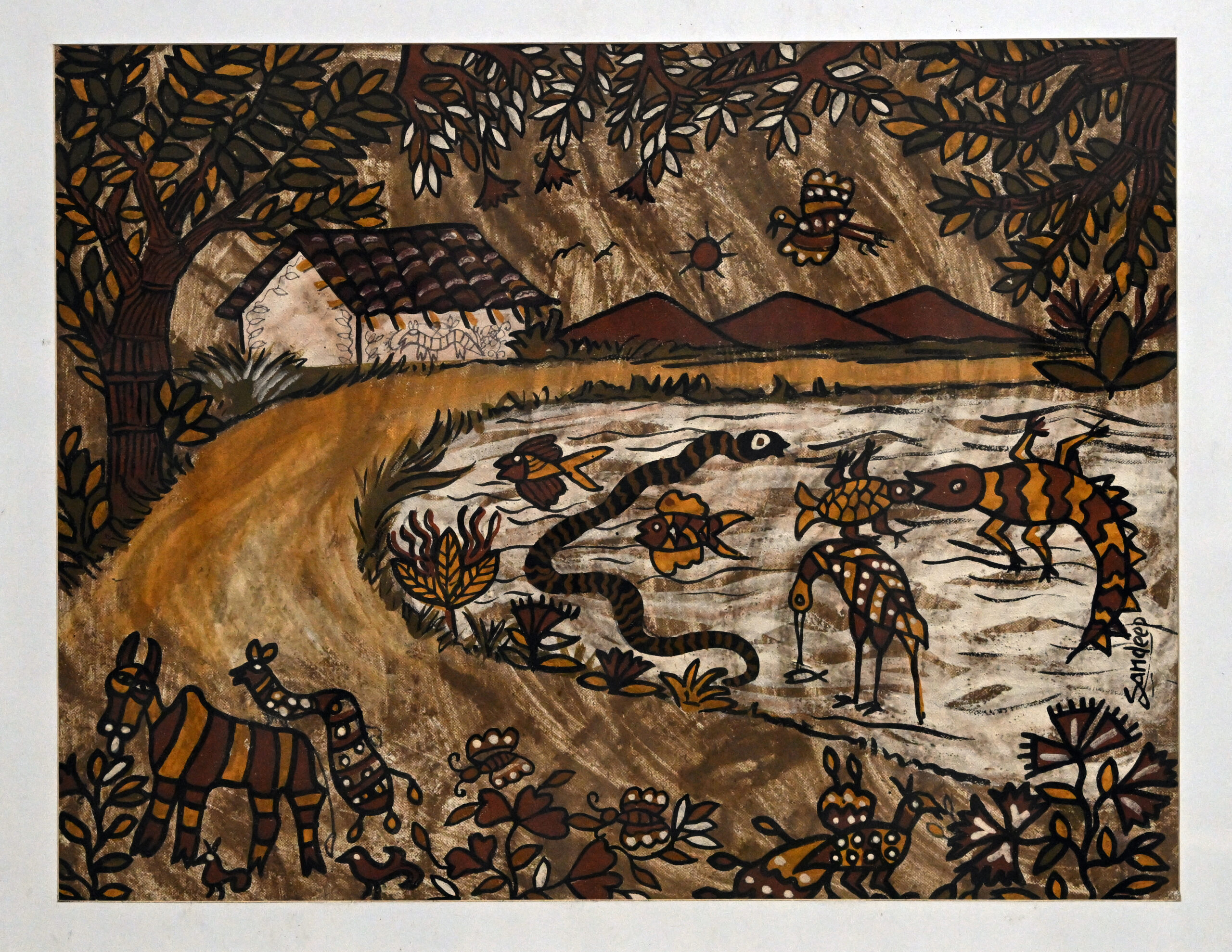 A pond ripples with life—fish, birds, snakes, and insects rendered in rhythmic, sacred patterns. A tiled-roof house rests beneath a sprawling tree, its path winding through a landscape kissed by sun and mountain. Each creature and leaf pulses with earthy color, as if the soil itself were storytelling. This Sohrai painting is a hymn to…
