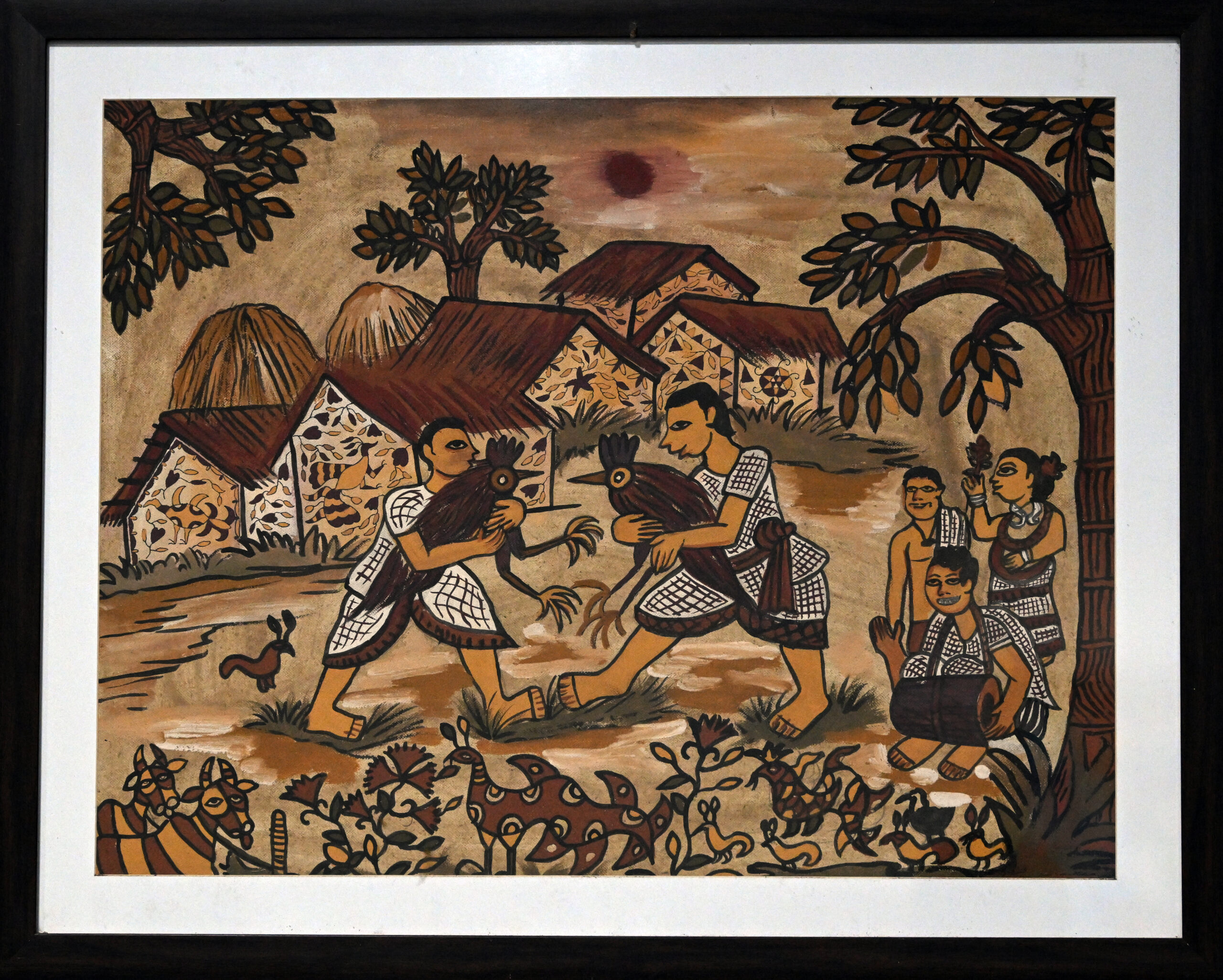 Two men grip roosters mid-battle, while villagers gather in a semicircle—watchful, animated, woven into ritual. Thatched homes and trees rise behind them, under a reddish sun that casts both warmth and tension. Animals roam below, echoing the primal energy of the scene, as if the earth itself were stirred by the contest. This Sohrai painting pulses with rural rhythm, where tradition, nature, and community collide in earthy celebration.