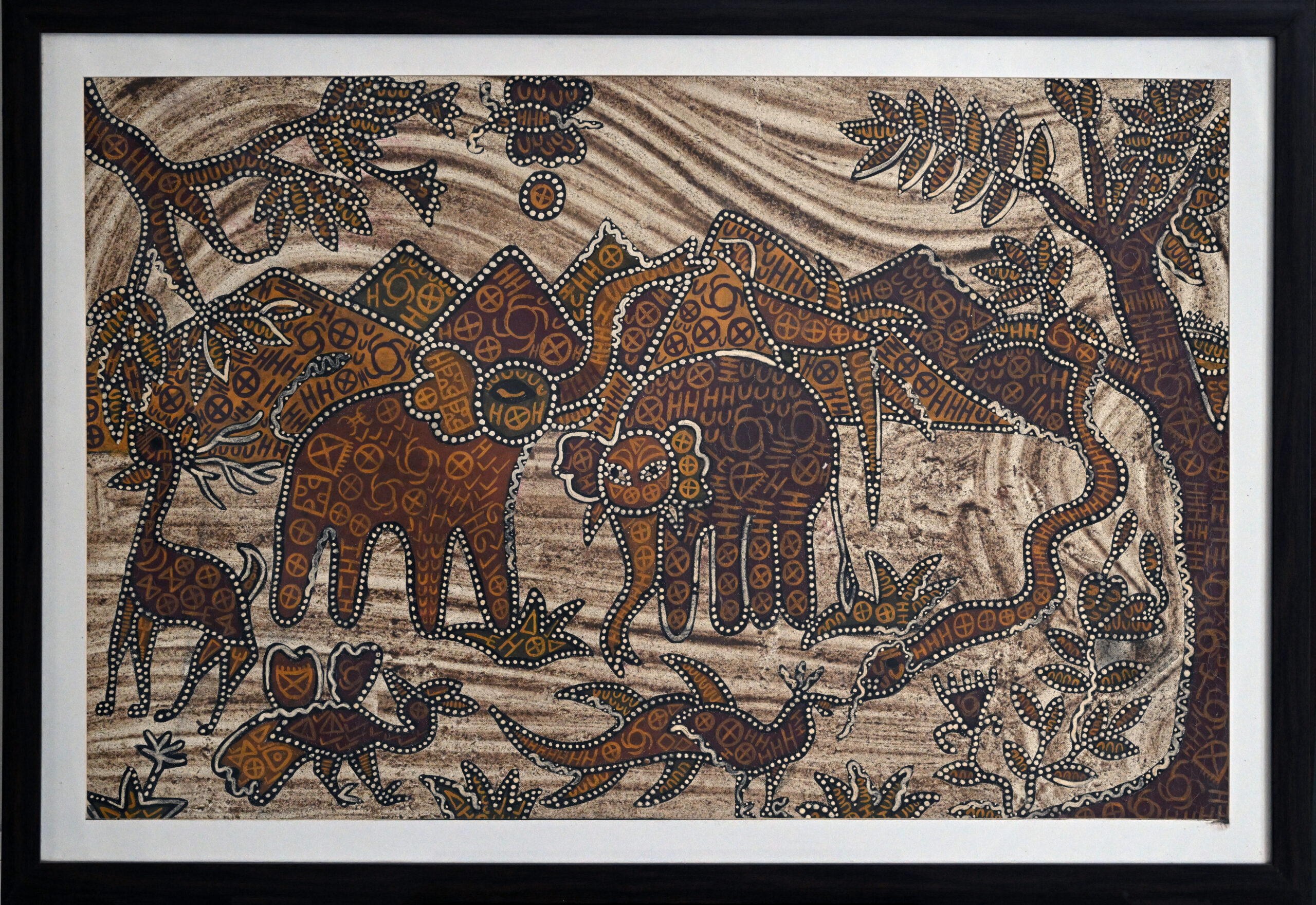 Two elephants stand adorned in rhythmic patterns, their bodies echoing the pulse of the earth and ancestry. Around them, deer, monkeys, birds, and serpents weave through a tapestry of mountains and trees, each creature a glyph of tribal memory. The palette—rich in ochres, blacks, and terracottas—feels like soil speaking, like rituals etched into the land.…