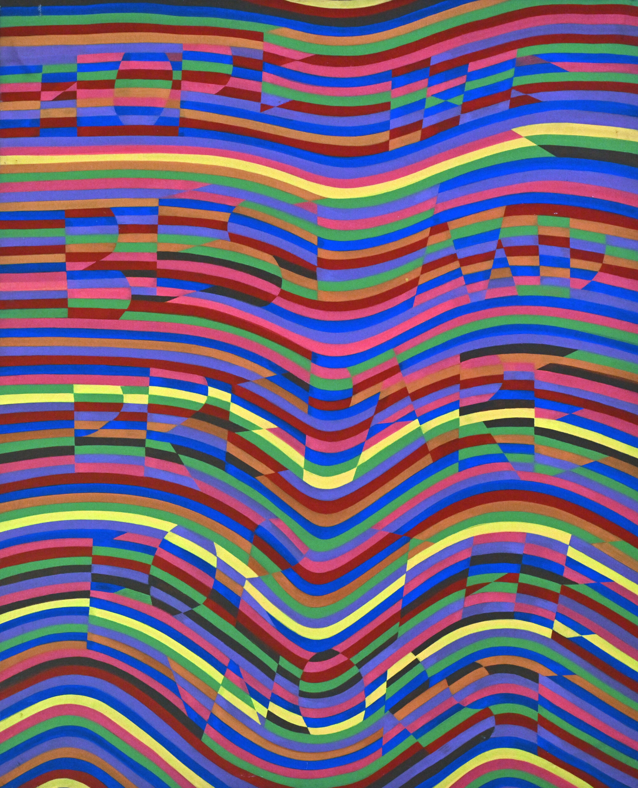 This vibrant abstract artwork features undulating horizontal stripes in bold hues of red, blue, green, yellow, and purple, creating a rhythmic visual flow. Within the colorful waves, a hidden message—“HOW WE BEHAVE PRIVATELY FORMS THE WORLD”—emerges through carefully interrupted patterns. The interplay of optical illusion and typography invites viewers to reflect on the subtle yet profound impact of personal actions. By merging vivid design with philosophical insight, the piece becomes both a visual puzzle and a contemplative statement.