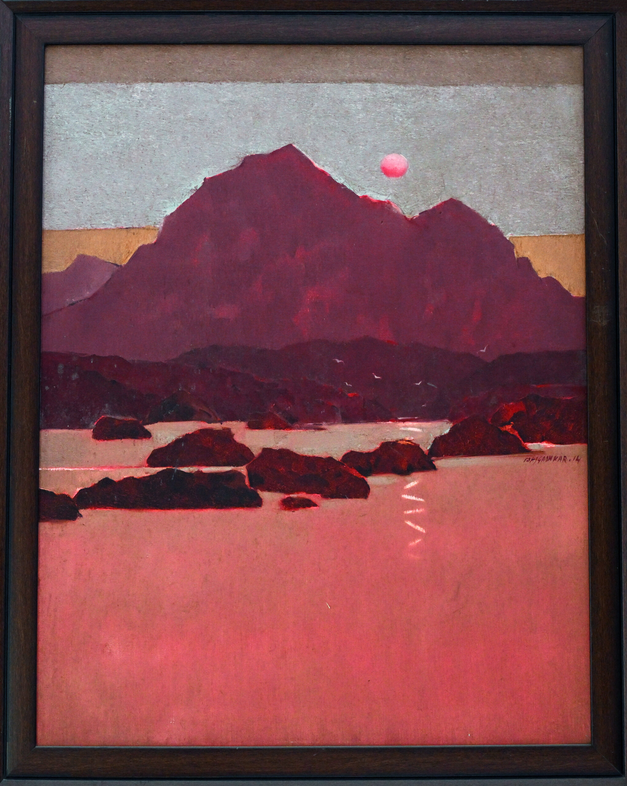 A crimson mountain looms like a memory, its silhouette etched against a sky of muted longing. A pink sun hovers quietly, casting a vertical shimmer across still waters strewn with dark stones. The palette—earthy reds, soft greys, and dusky pinks—evokes a surreal hush, as if time itself has paused to listen. This landscape becomes a dreamscape, where solitude and mystery ripple in quiet communion.