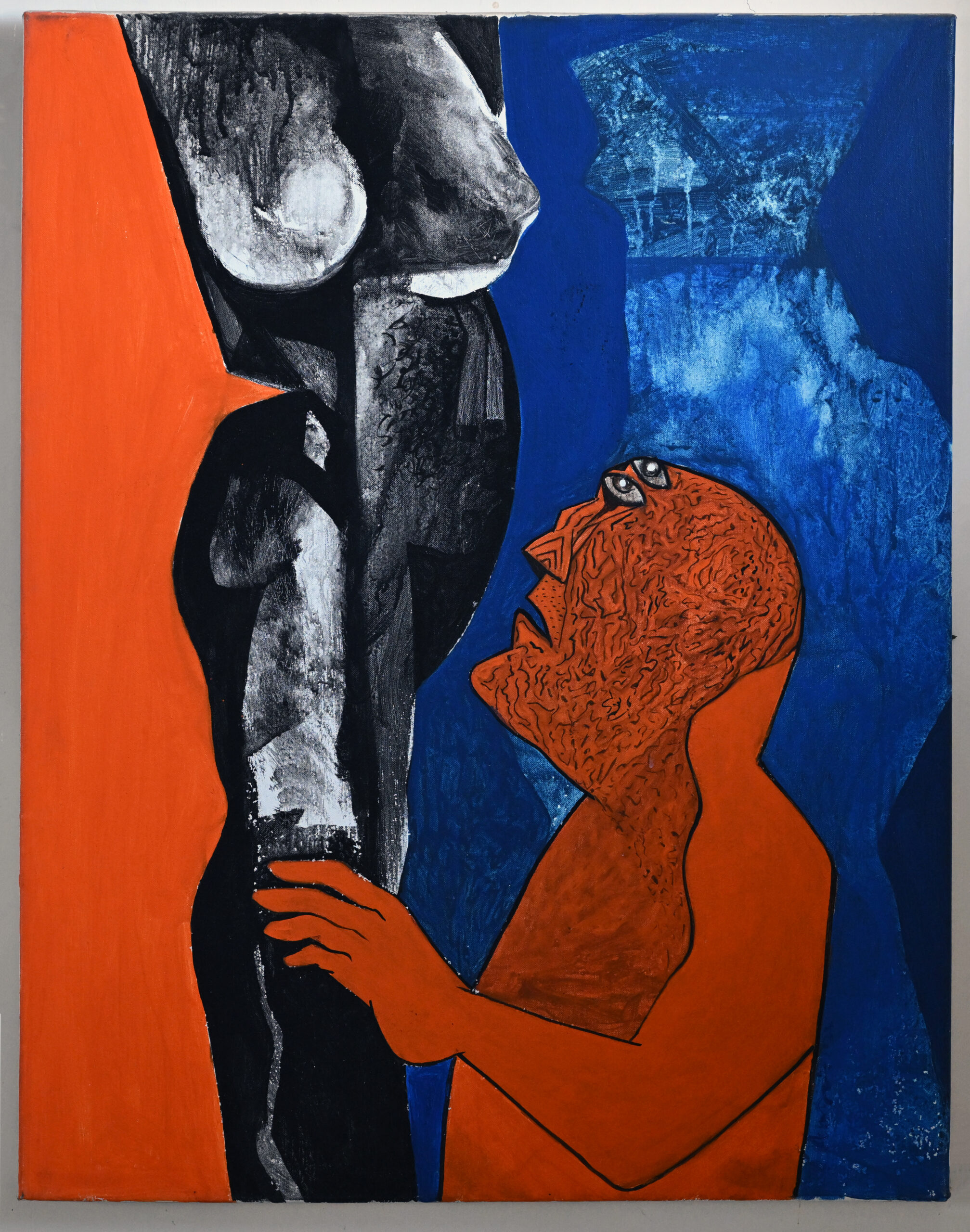 This striking artwork features two abstract human figures set against vivid, contrasting backgrounds of orange and blue. The larger black-and-white figure stands tall and muscular, while the smaller orange figure gazes upward with wide eyes and an outstretched arm, suggesting awe or yearning. The textured surfaces and exaggerated forms evoke emotional tension and symbolic depth.…