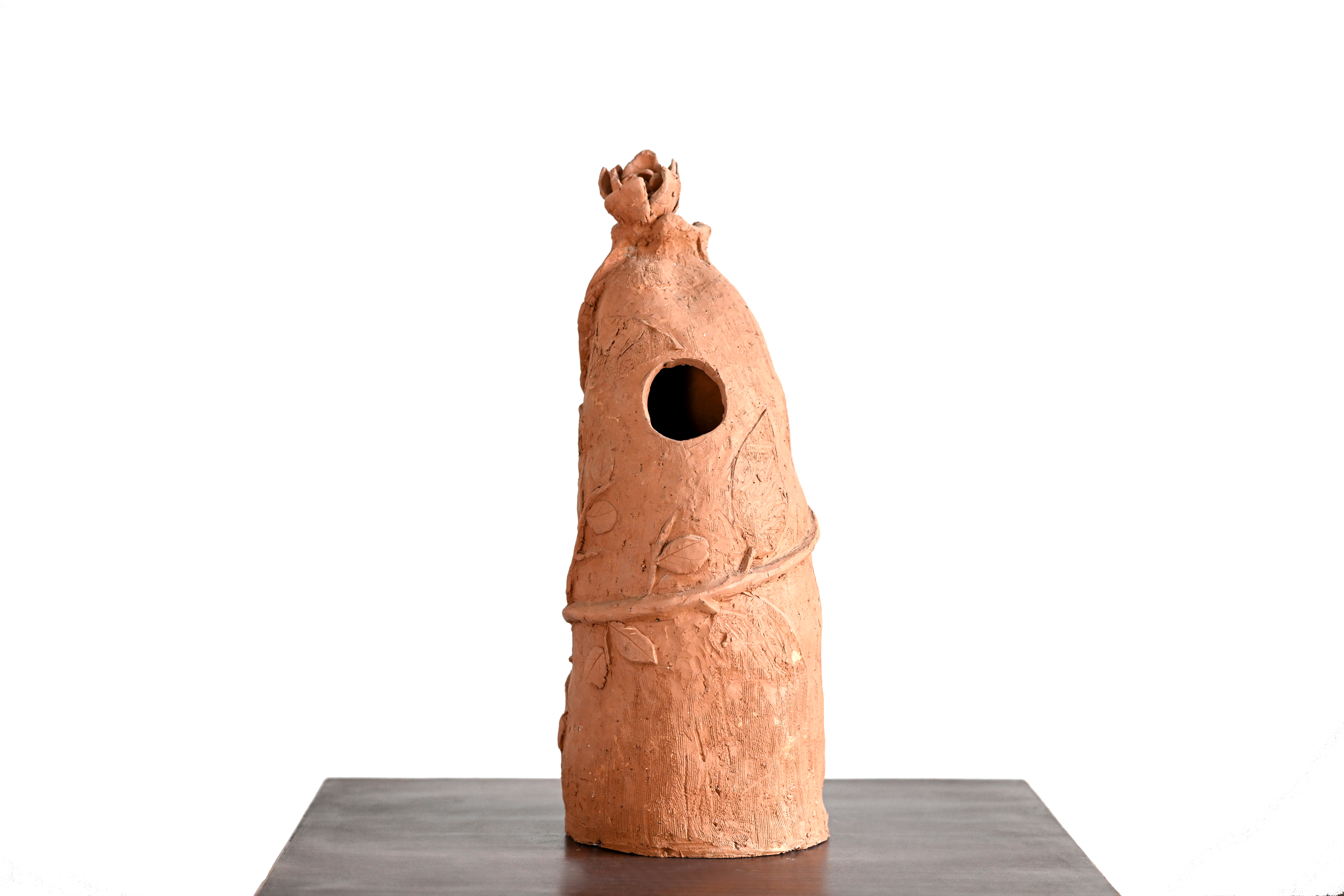 This organic terracotta sculpture features a tall, slender form with an uneven, tapering silhouette that resembles a natural vessel or a hollowed tree trunk. A central, dark circular opening provides a focal point, while a delicate vine with small leaves winds around the exterior of the piece. The sculpture is crowned with a stylized rose…