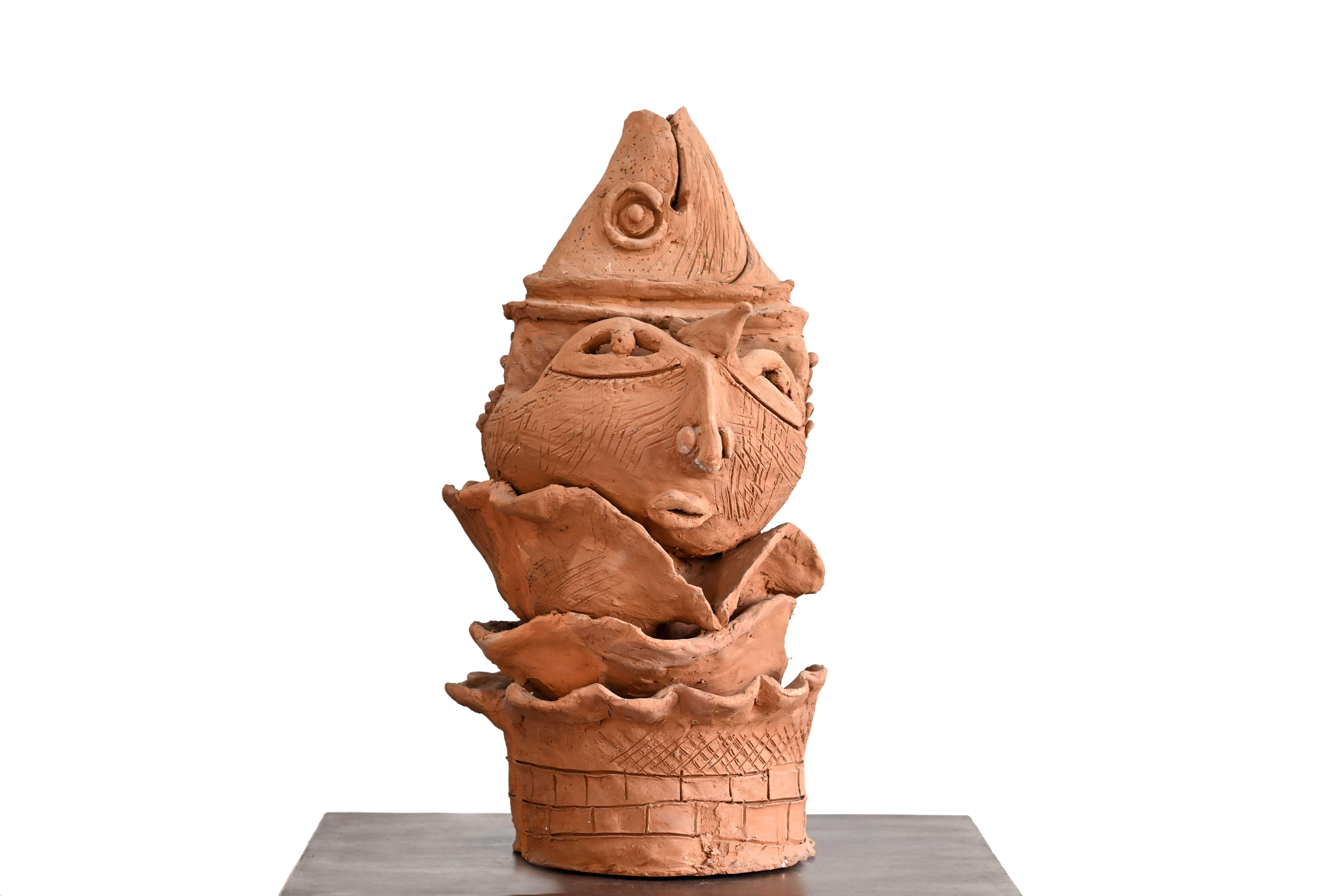 This vertical terracotta sculpture features a wide-eyed, expressive face set within a series of unfurling petal-like layers that emerge from a textured, cylindrical base. The figure wears a tall, pointed headdress decorated with a simple circular motif, lending it a ritualistic or folkloric appearance. Intricate cross-hatching and etched lines cover the surface of the clay,…