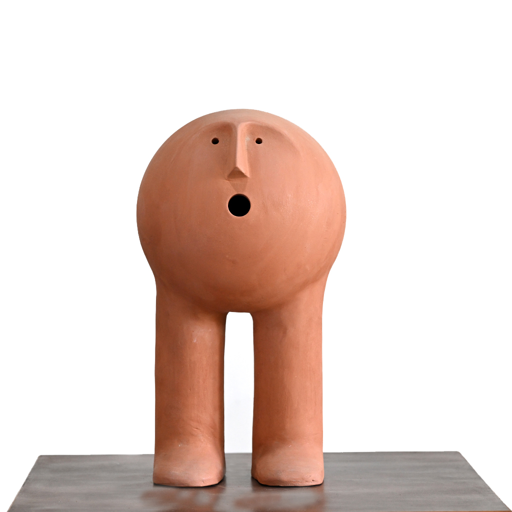 This unique terracotta sculpture features a wide-eyed, expressive face nestled within multiple layers of unfurling, petal-like forms that rise from a textured cylindrical base. The figure is crowned with a tall, pointed headdress adorned with a circular emblem, giving the piece a distinct folkloric or ritualistic character. Throughout the work, the natural orange-red clay is…