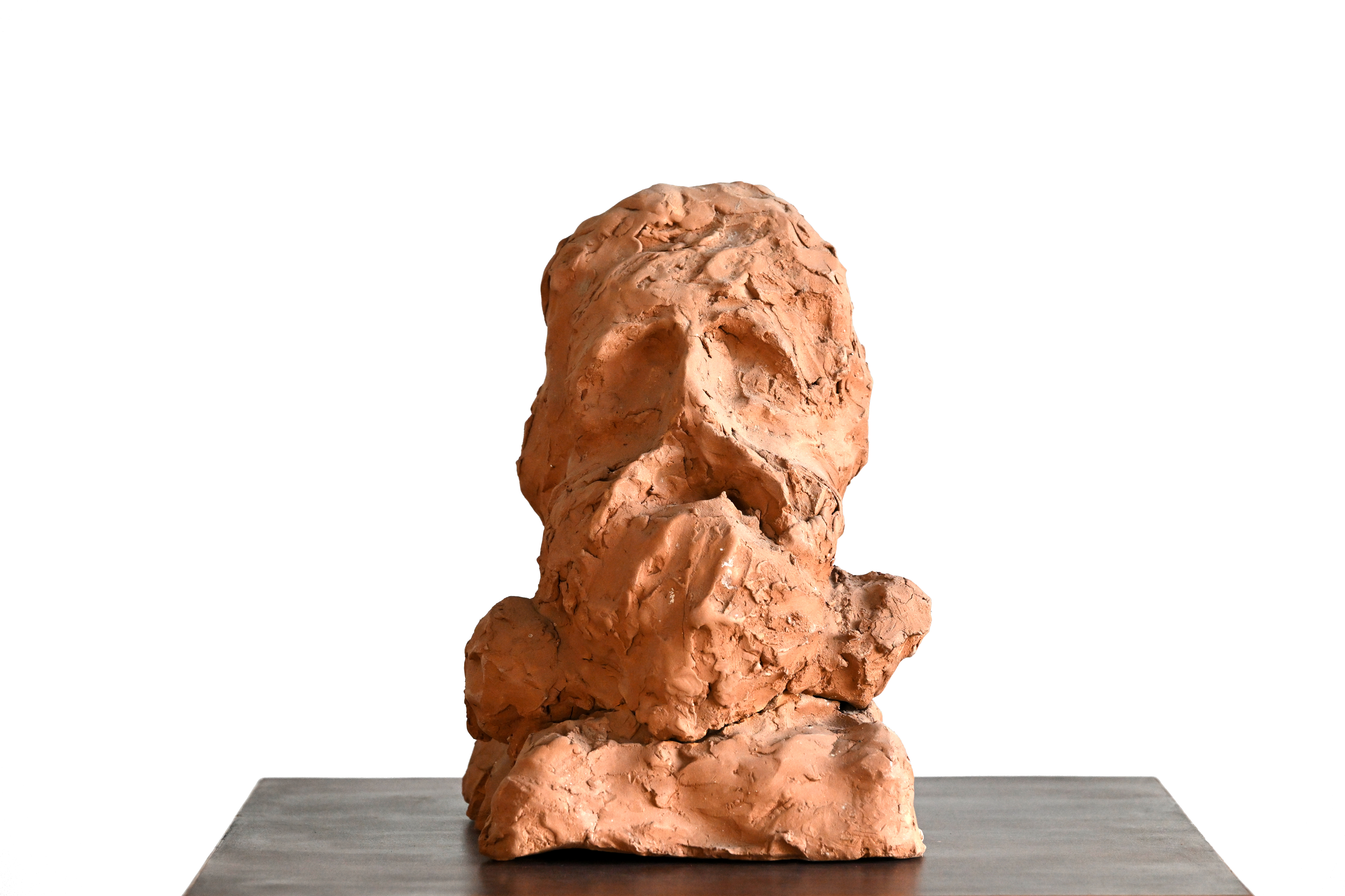 This unique terracotta sculpture features a wide-eyed, expressive face nestled within multiple layers of unfurling, petal-like forms that rise from a textured cylindrical base. The figure is crowned with a tall, pointed headdress adorned with a circular emblem, giving the piece a distinct folkloric or ritualistic character. Throughout the work, the natural orange-red clay is…