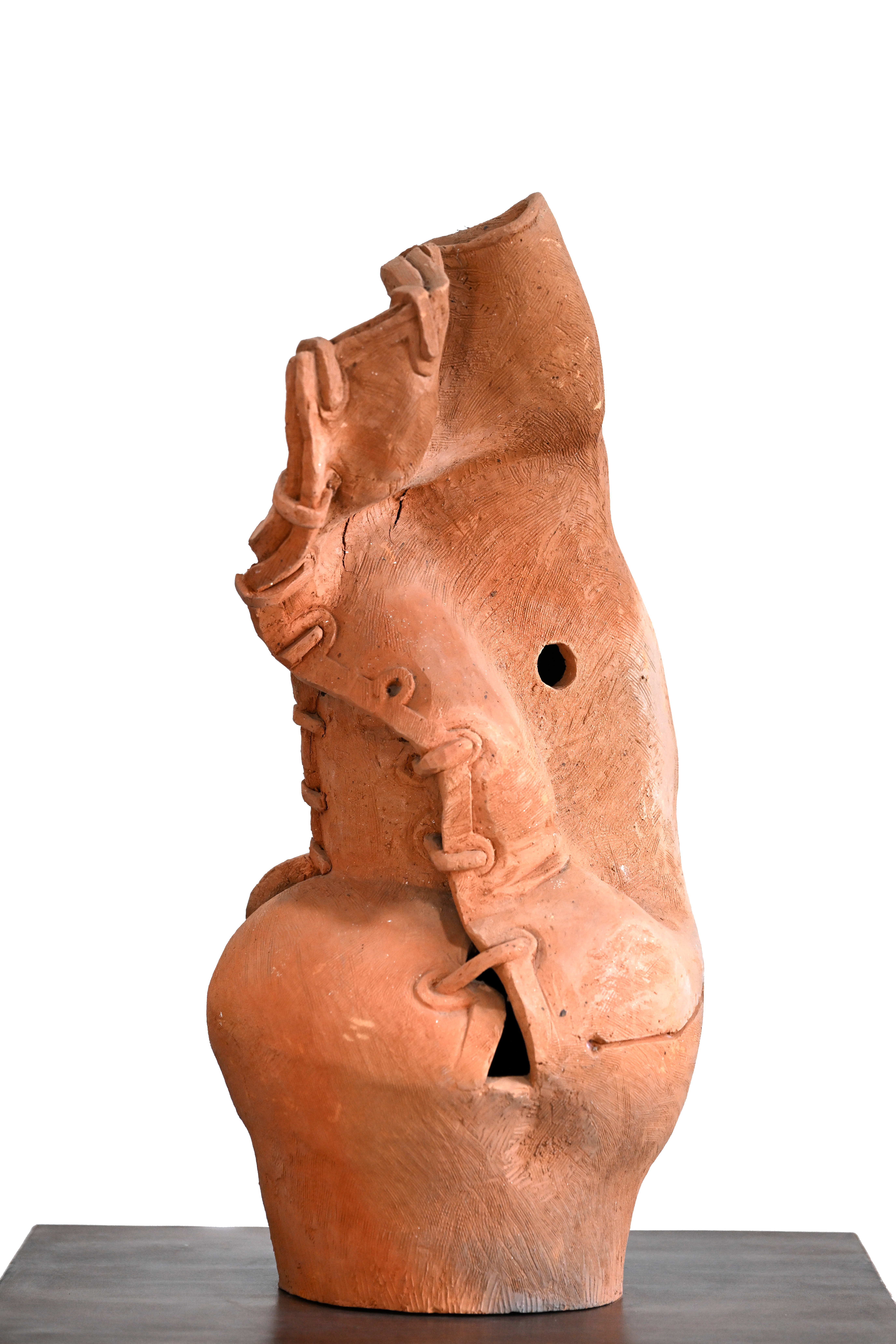 This vertical terracotta sculpture features a wide-eyed, expressive face nestled within multiple layers of unfurling, petal-like forms that rise from a textured cylindrical base. The figure is crowned with a tall, pointed headdress adorned with a circular emblem, giving the piece a distinct folkloric or ritualistic character. Throughout the work, the natural orange-red clay is…