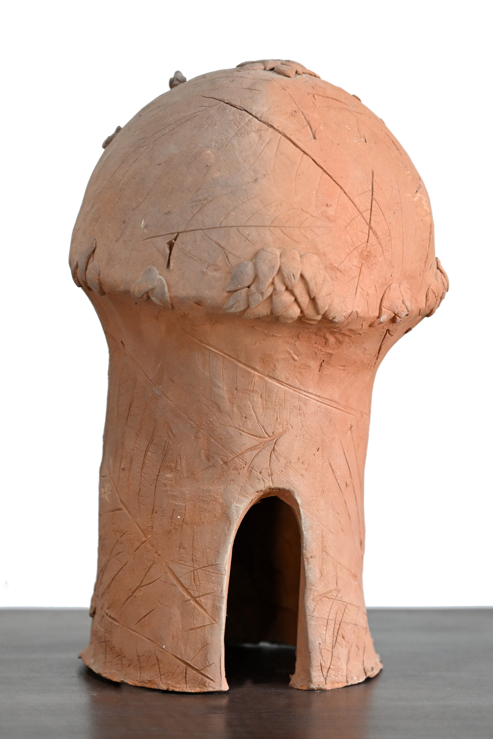 This unique terracotta sculpture features a wide-eyed, expressive face nestled within multiple layers of unfurling, petal-like forms that rise from a textured cylindrical base. The figure is crowned with a tall, pointed headdress adorned with a circular emblem, giving the piece a distinct folkloric or ritualistic character. Throughout the work, the natural orange-red clay is…