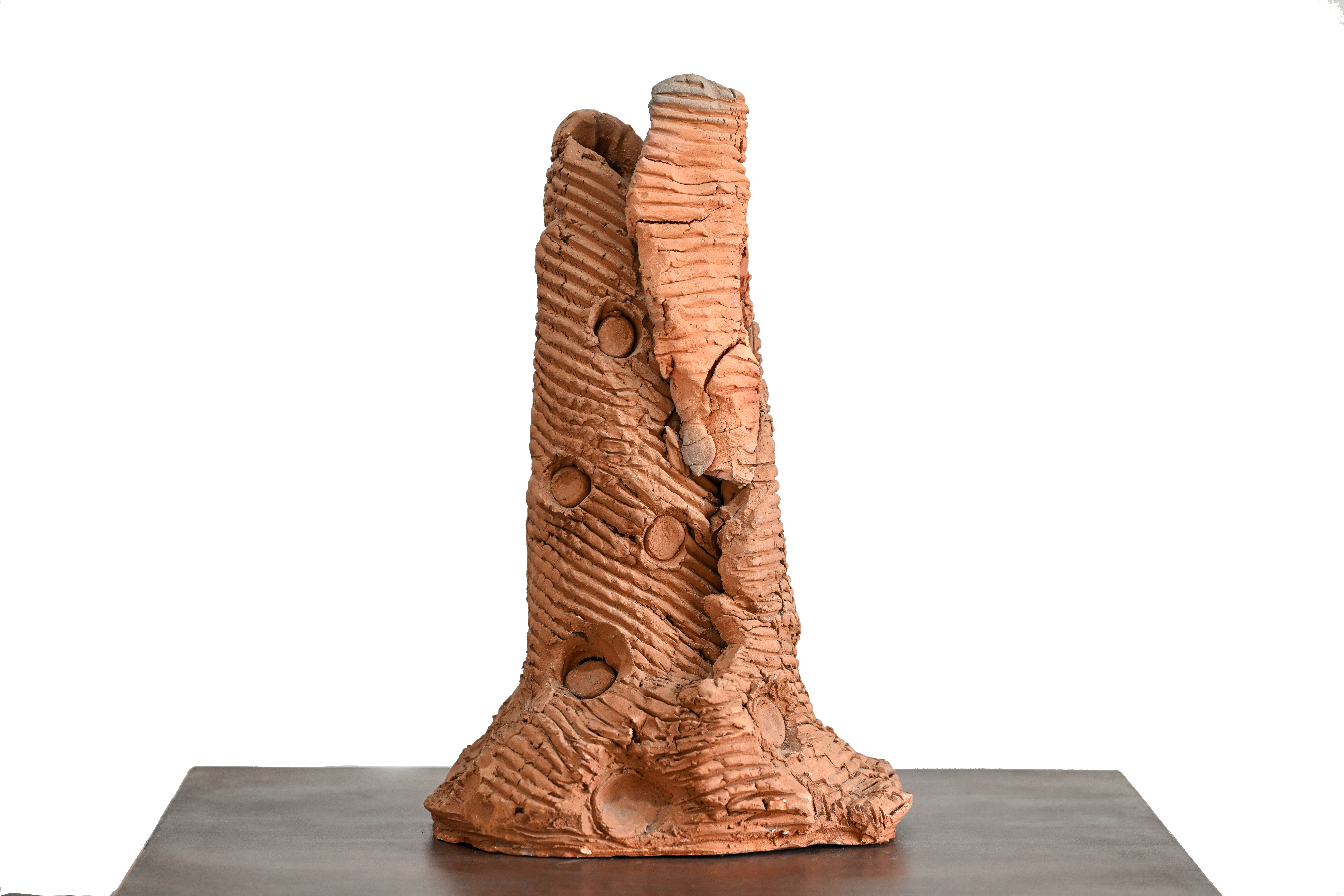 This unique terracotta sculpture features a wide-eyed, expressive face nestled within multiple layers of unfurling, petal-like forms that rise from a textured cylindrical base. The figure is crowned with a tall, pointed headdress adorned with a circular emblem, giving the piece a distinct folkloric or ritualistic character. Throughout the work, the natural orange-red clay is…