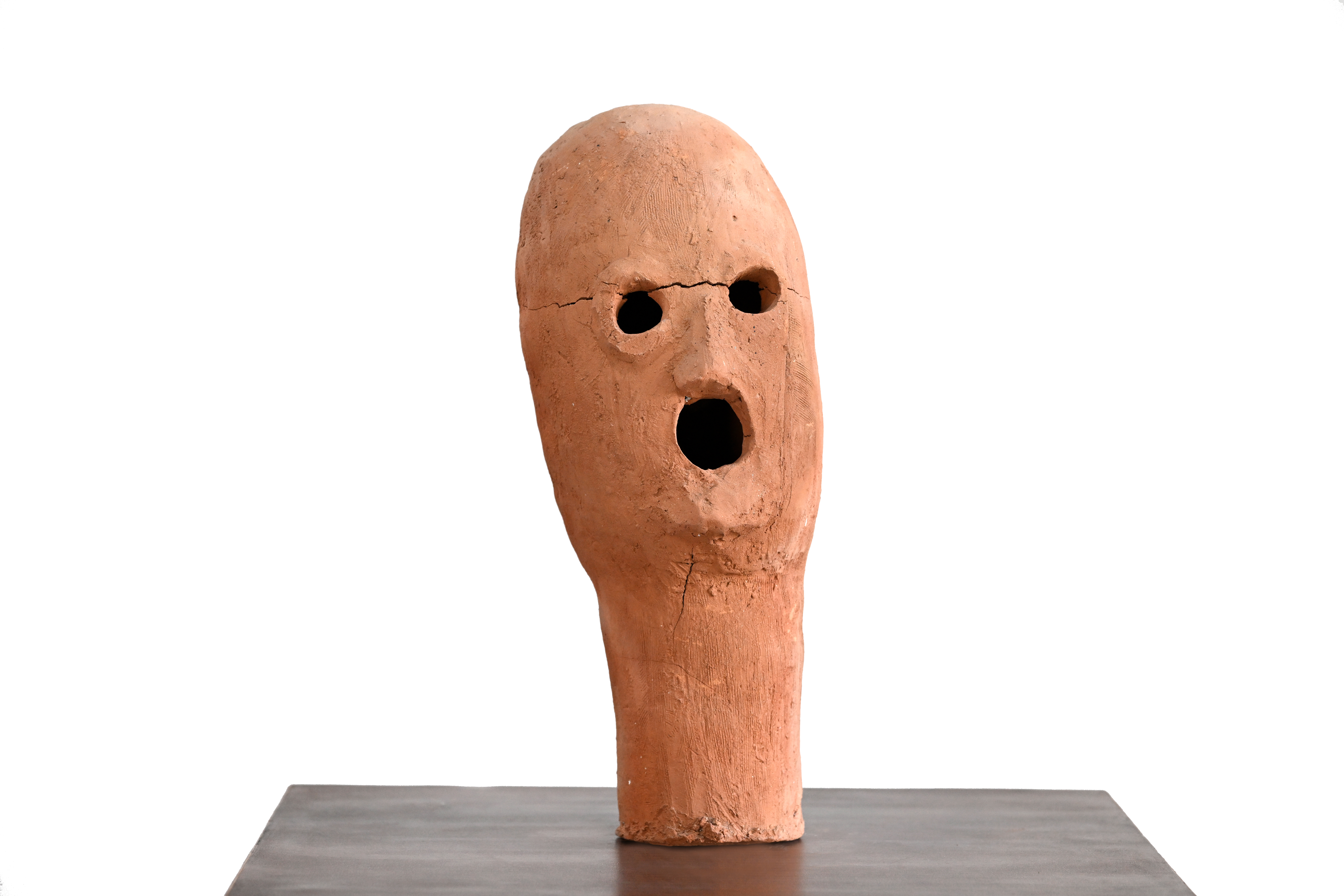 A terracotta head rises with haunting simplicity—its hollow eyes and open mouth echo silent, ancient cries. The elongated neck and rough, cracked surface evoke both ritual and ruin, as if time itself shaped its sorrow. Each imperfection feels intentional, a testament to endurance and expressive decay. This sculpture stands like a relic of emotion, where emptiness becomes voice and clay remembers.