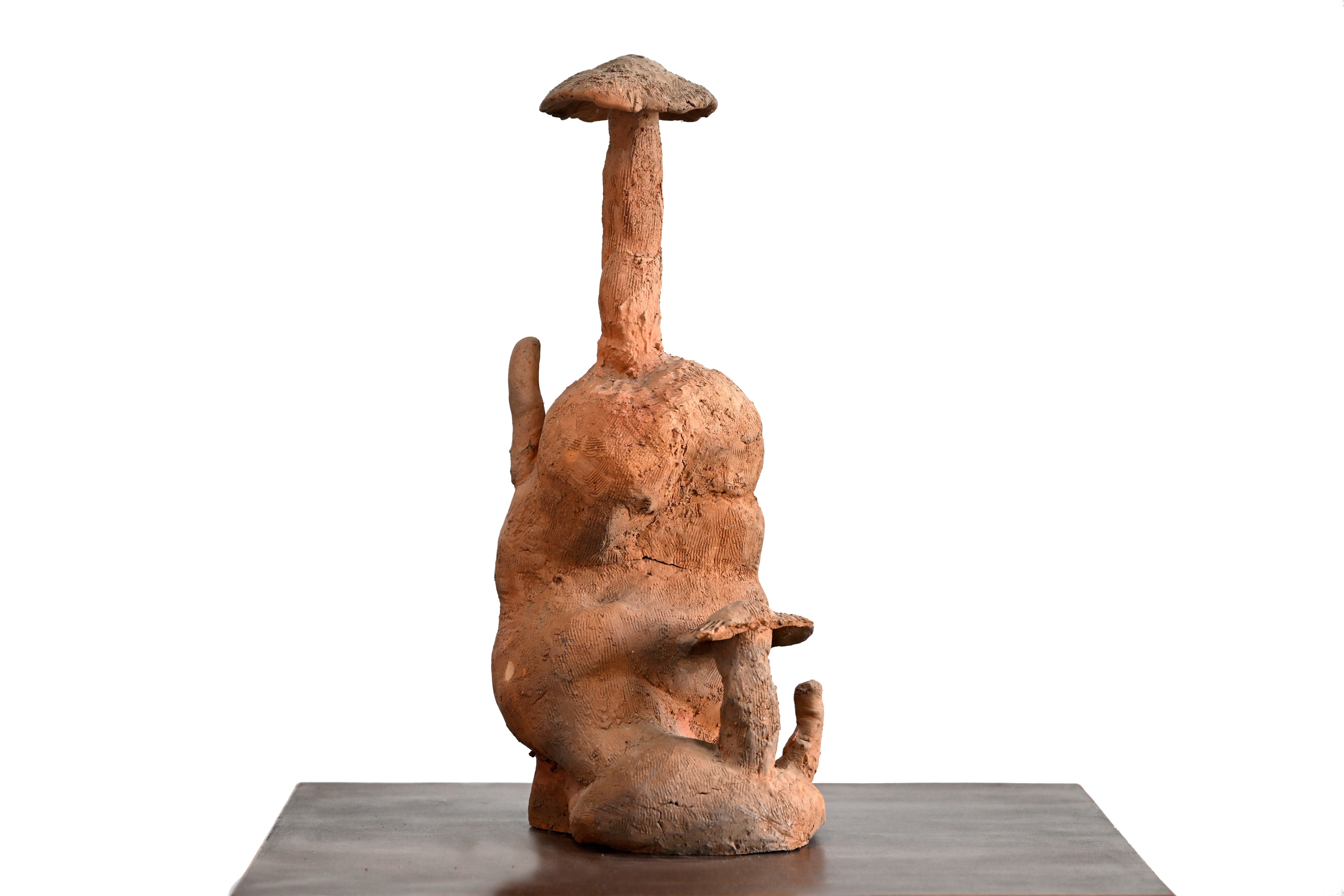 A slender clay column rises like a dreaming stalk, crowned by a mushroom cap that whispers of forest spirits. From its base, other fungal forms and textured limbs sprout in chaotic harmony, evoking growth, decay, and rebirth. The rough surface, hand-molded and raw, feels like earth remembering its own stories. This surreal sculpture becomes a ritual of nature—abstract yet alive, rooted in mystery and transformation.