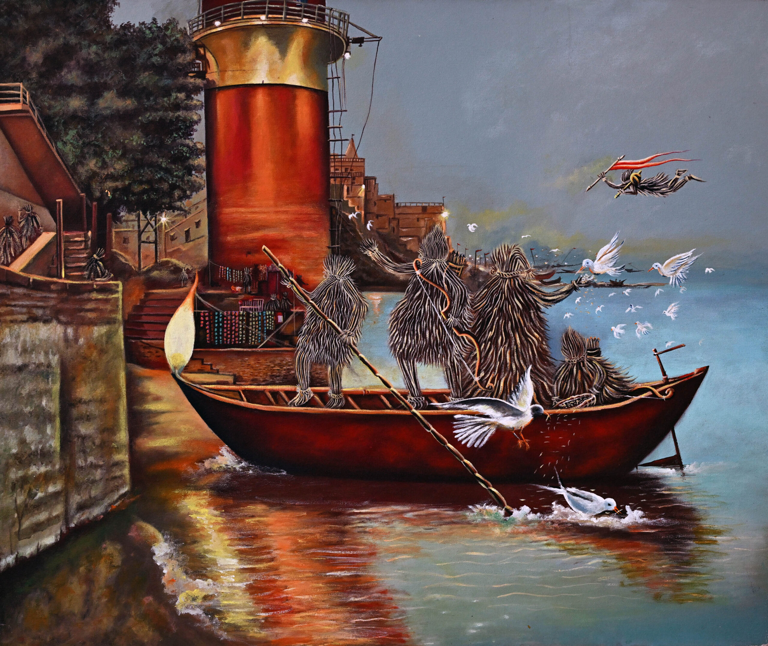 Alok Bhushan conjures a surreal maritime dream where shaggy, sentient beings row a crimson boat beneath a towering lighthouse. White birds splash and soar around them, blurring the line between whimsy and ritual, while a caped creature glides overhead like a guardian of fantasy. The water mirrors the warmth of the boat and tower, contrasting…