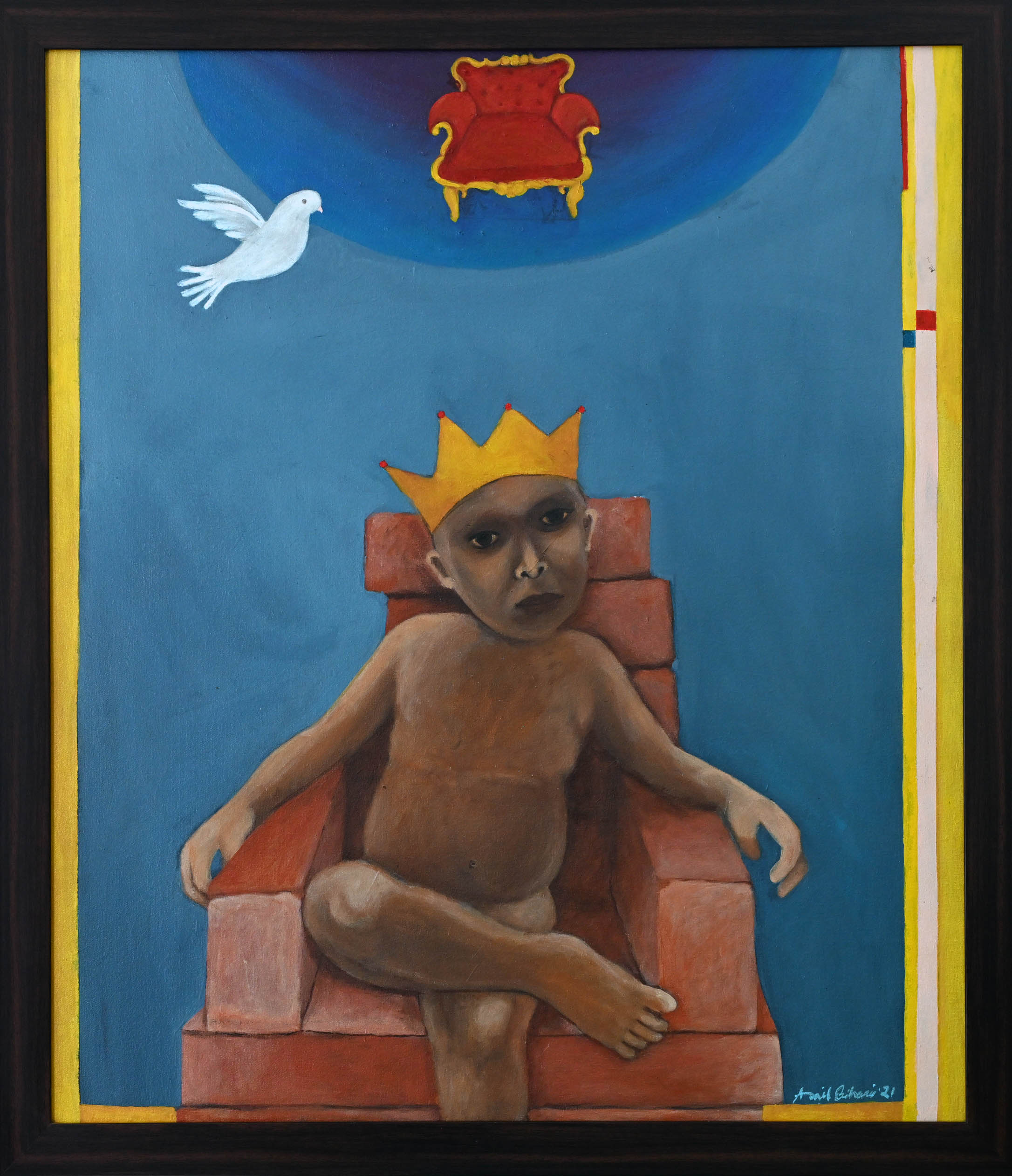Anil Bihari’s painting places a crowned child on a throne of red bricks, evoking innocence wrapped in symbolic power. Above, a golden chair floats within a blue halo, suggesting divine aspiration or the weight of imagined authority. A white dove hovers nearby, whispering peace into the solemn stillness of the scene. This composition becomes a quiet parable—where childhood, sovereignty, and longing converge in ritual contrast.