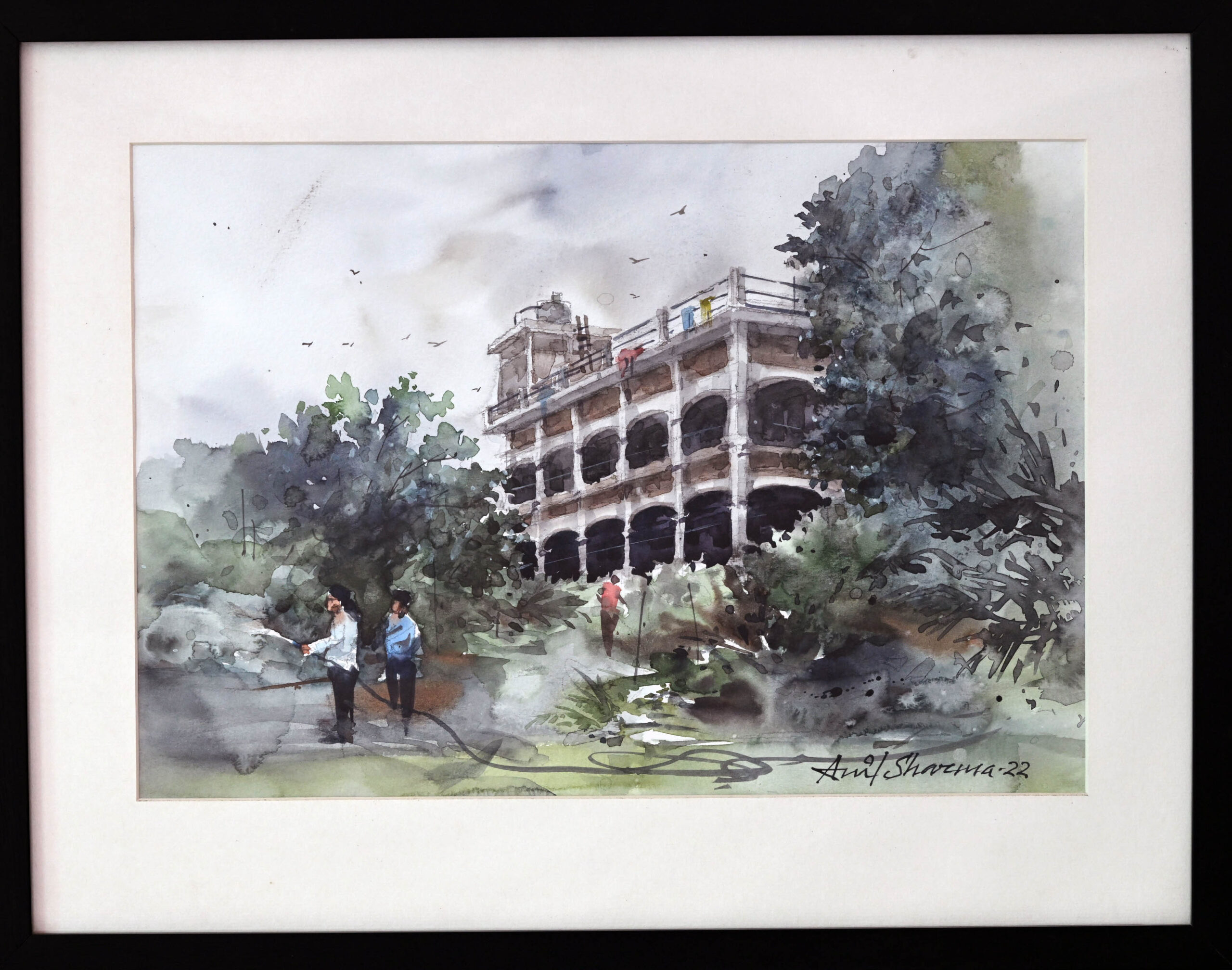 A weathered colonial building rises amid lush greenery, its arched windows and balconies whispering stories of time. Figures move gently in the foreground—talking, walking—adding life to the quiet grandeur. Birds scatter across a cloudy sky, echoing the mood of fleeting moments and layered memory. In Anil Sharma Yusuf’s watercolor, architecture becomes emotion, and every brushstroke a trace of lived history.