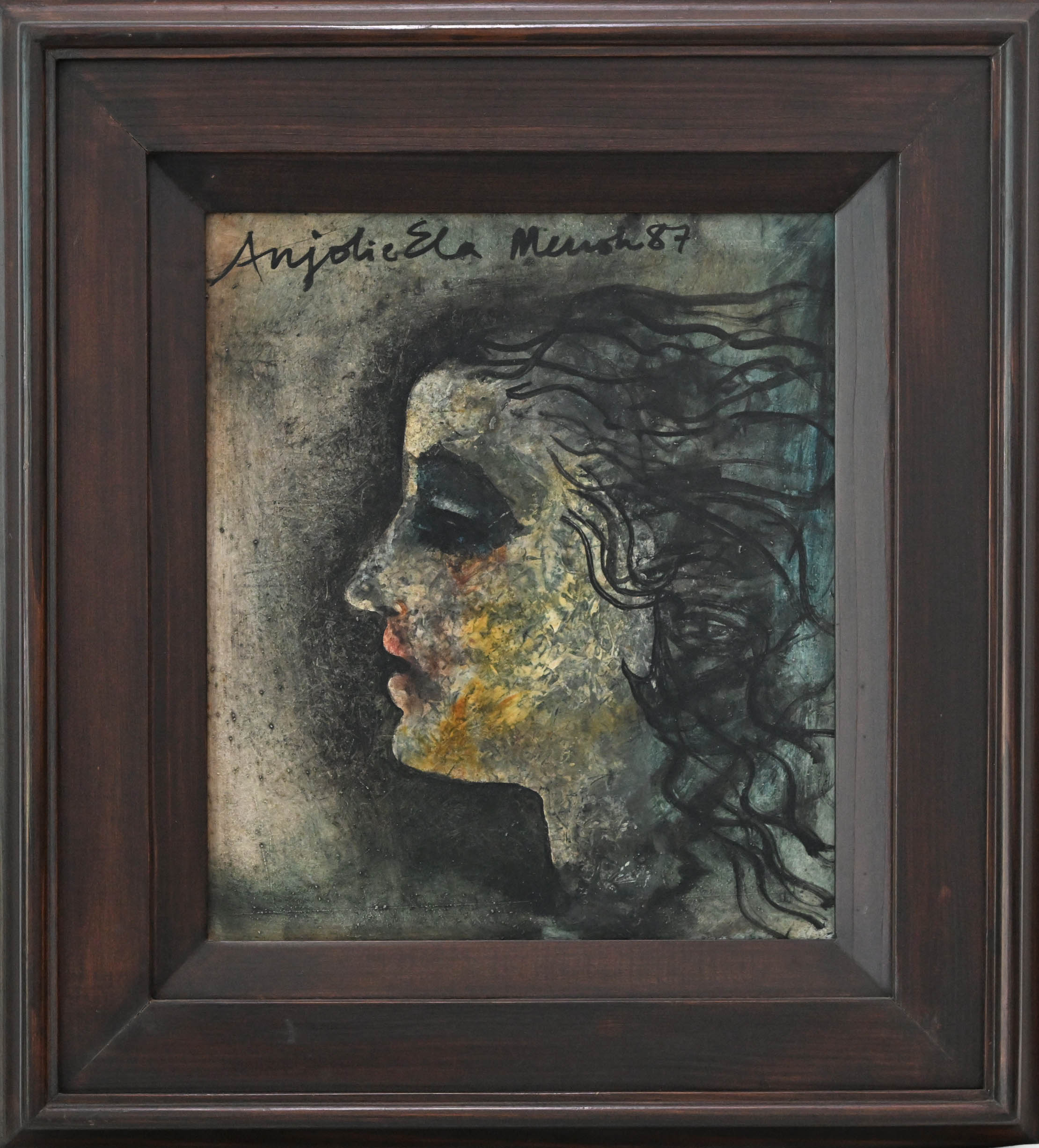 Anjolie Ela Menon’s portrait captures a contemplative profile, the face rendered in moody tones that evoke quiet intensity. Swirling dark lines flow from the hair, merging emotion with abstraction in a gesture of inner turbulence. The muted green-gray background deepens the solitude, allowing the figure’s upward gaze to suggest longing or transcendence. It’s a textured meditation—where silence, memory, and spirit converge in a single, expressive breath.