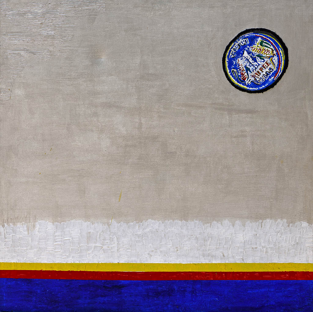 This abstract composition by Anup Kumar Chand reimagines the Colombian flag through a textured, minimalist lens, blending national symbolism with meditative gray space. The emblem in the upper quadrant anchors the piece in identity, while the horizontal bands of yellow, red, and blue evoke heritage, conflict, and resilience. Above them, the expansive gray and white suggest ambiguity, transition, or the subconscious realm—a hallmark of Chand’s post-realist style. His work often explores improbable scenarios and emotional depth, merging folklore, memory, and modernity into layered visual narratives.
