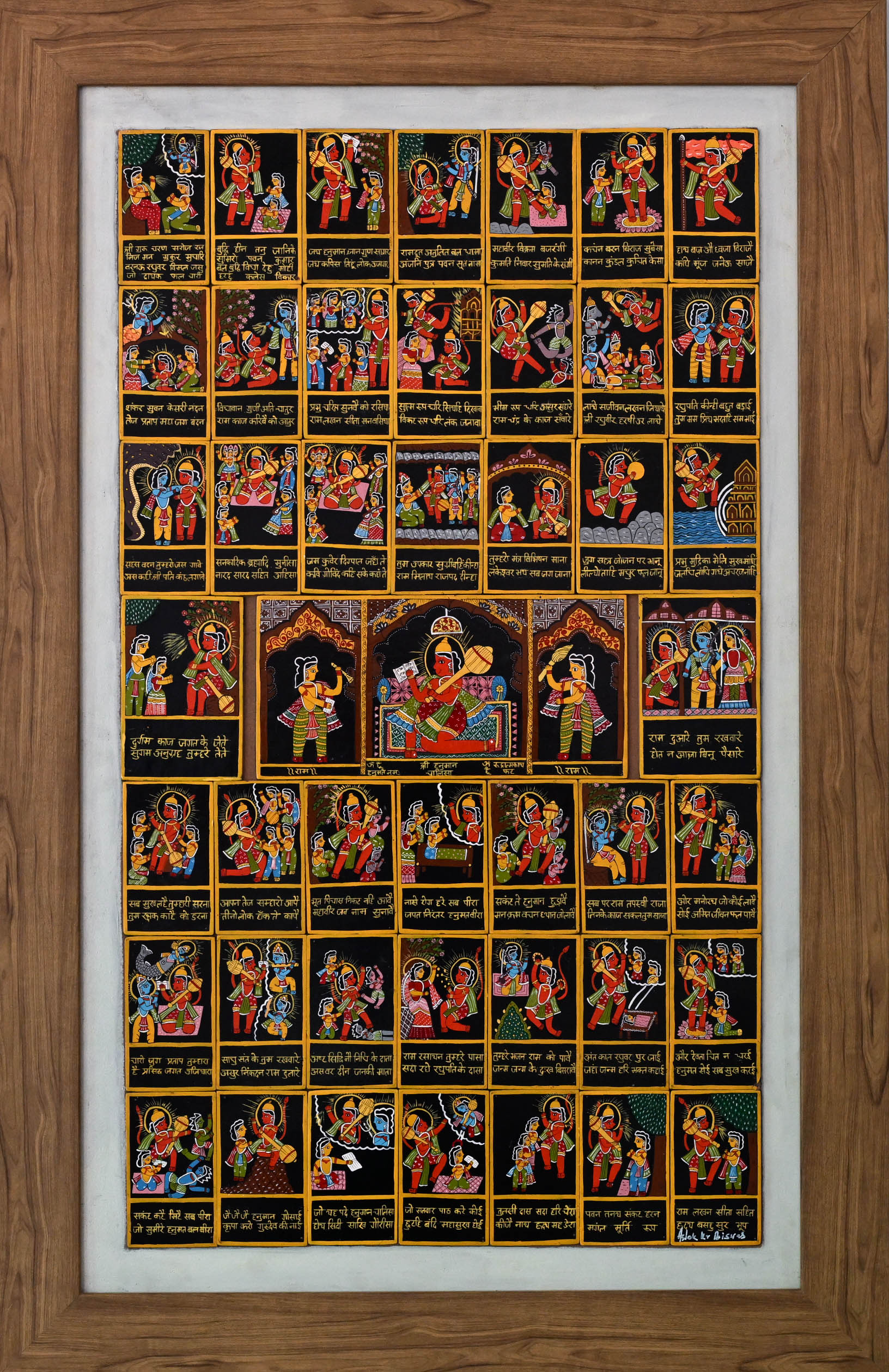A divine figure sits enthroned at the center, surrounded by panels that unfold a mythic tapestry in miniature. Each scene, etched with vibrant detail and Devanagari script, becomes a verse in a visual scripture. The grid format evokes both order and devotion, guiding the viewer through cycles of cosmic narrative. In Ashok Kumar Biswas’s storytelling, tradition breathes through color and line—where gods, devotees, and legends converge in sacred rhythm.