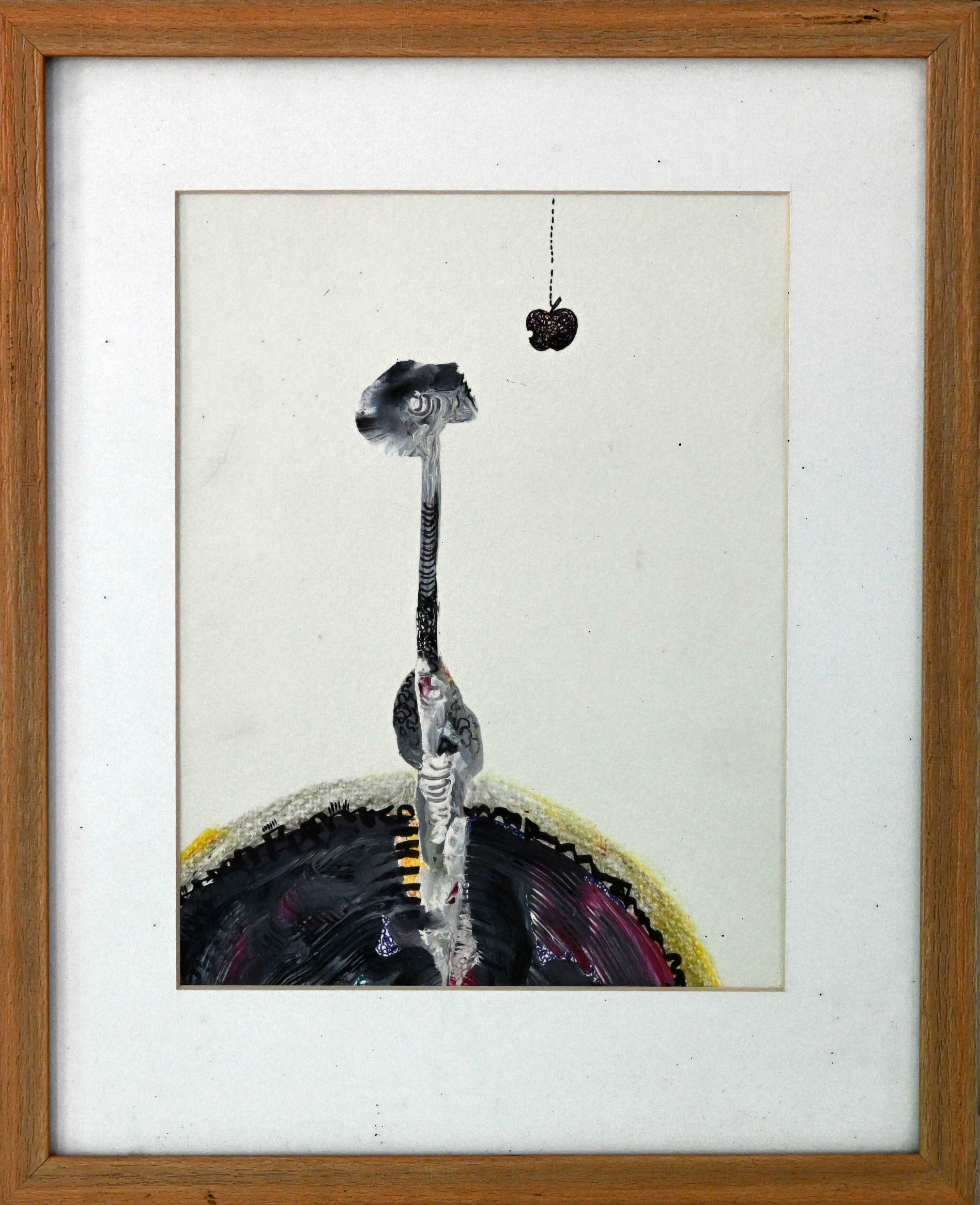A surreal creature stretches its long neck skyward, its layered body textured with shadow and light. Suspended above, a dark fruit-like form dangles—a quiet symbol of longing, offering, or cosmic play. Beneath it, a semicircular base in purple and yellow anchors the figure, grounding its ascent in mystery. This artwork whispers of transformation and tension,…