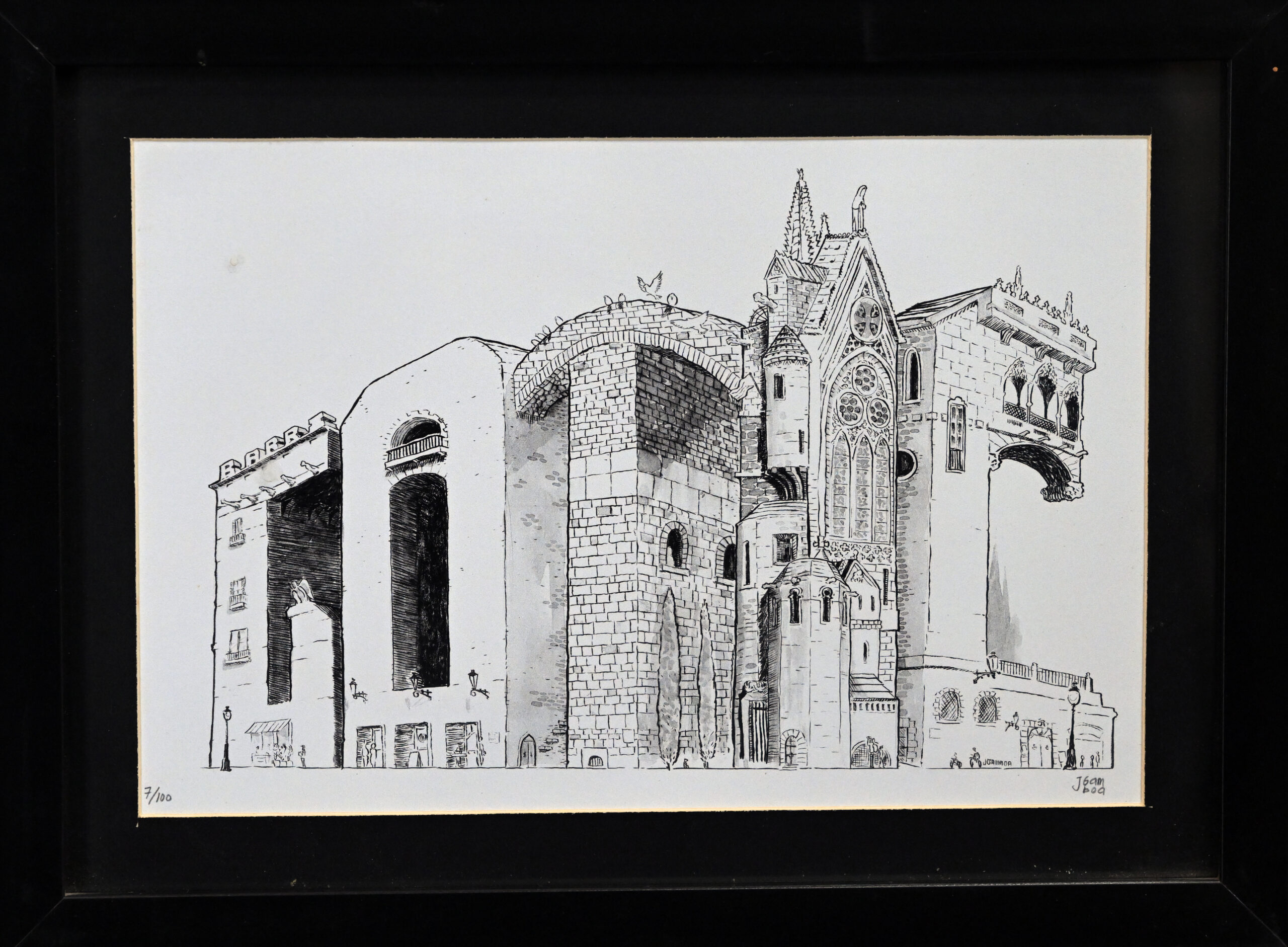 A fantastical Barcelona façade rises like a cathedral of dreams, blending Gothic arches with surreal whimsy. Oversized stonework and floating forms twist architectural logic into poetic illusion. Each line pulses with imaginative tension, as if the building itself were caught mid-transformation. It is a monument to the city’s mythic soul—where history and fantasy cohabit in ink.