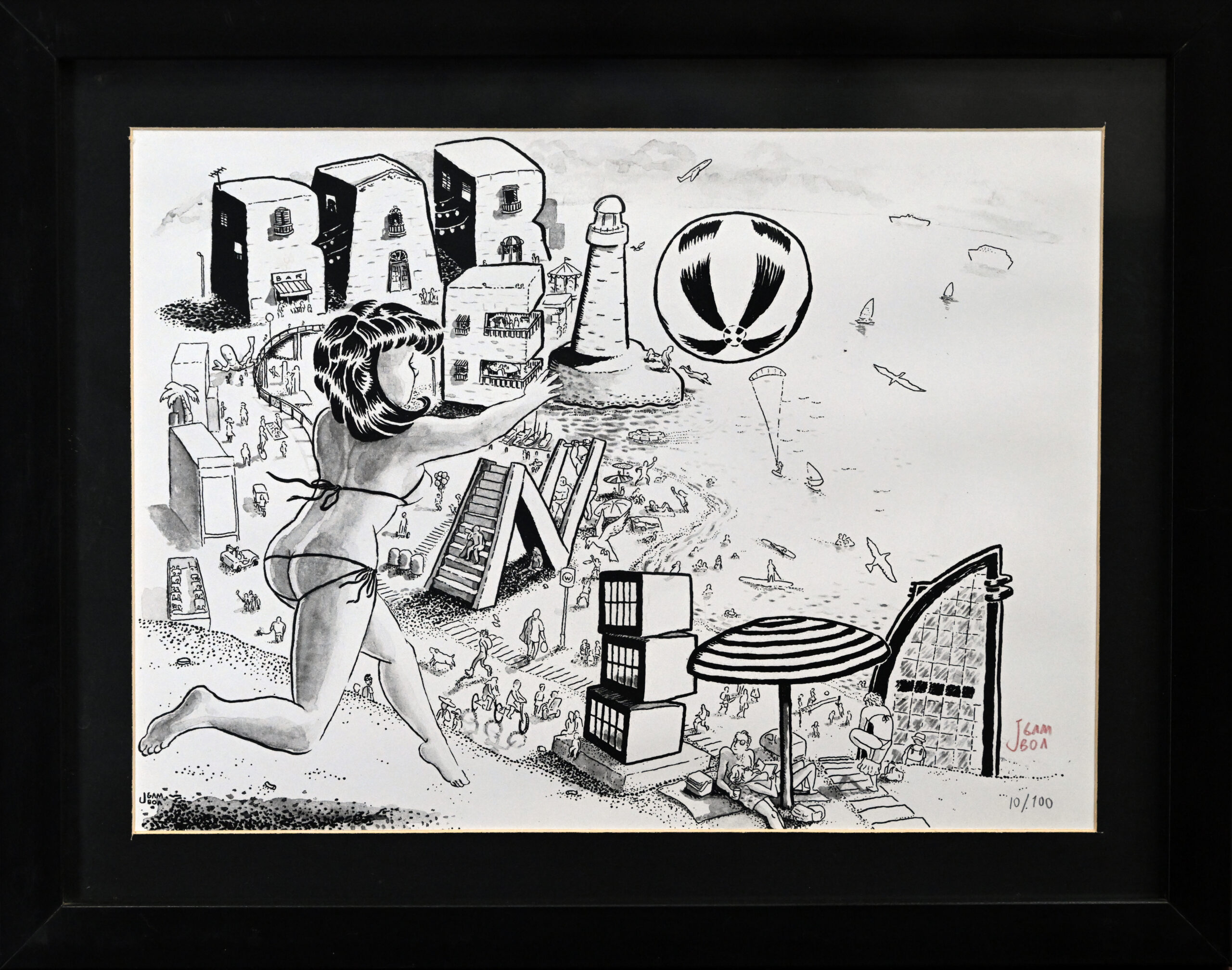 A surreal Barcelona beach pulses with playful chaos, where bold letters spell “BAR” like architectural mirage. A woman leaps toward a patterned beach ball, her motion echoing the city’s vibrant spontaneity. Umbrellas, lighthouses, and abstract forms mingle like dreams sculpted in sand and stone. Boats drift in the distance, while tiny figures animate the shore—a carnival of movement beneath a cartoon sky.