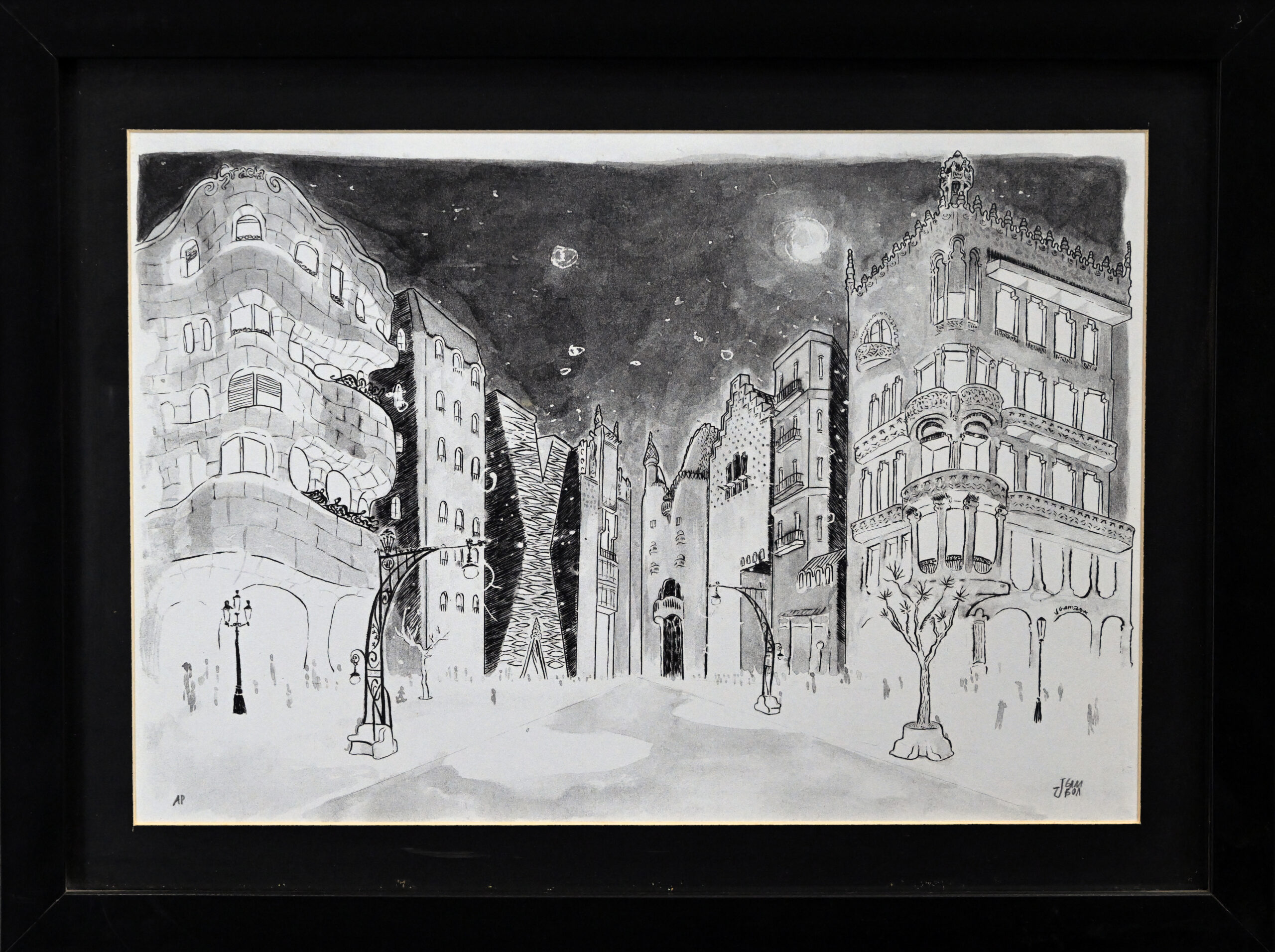 A quiet Barcelona street stretches into the night, its symmetry echoing the city’s architectural rhythm. Ornate facades rise like stone lullabies, blending rounded balconies with angular shadows that whisper of history. The starry sky above casts a cosmic hush, while sparse trees and lampposts stand like sentinels of solitude. At the vanishing point, an archway…