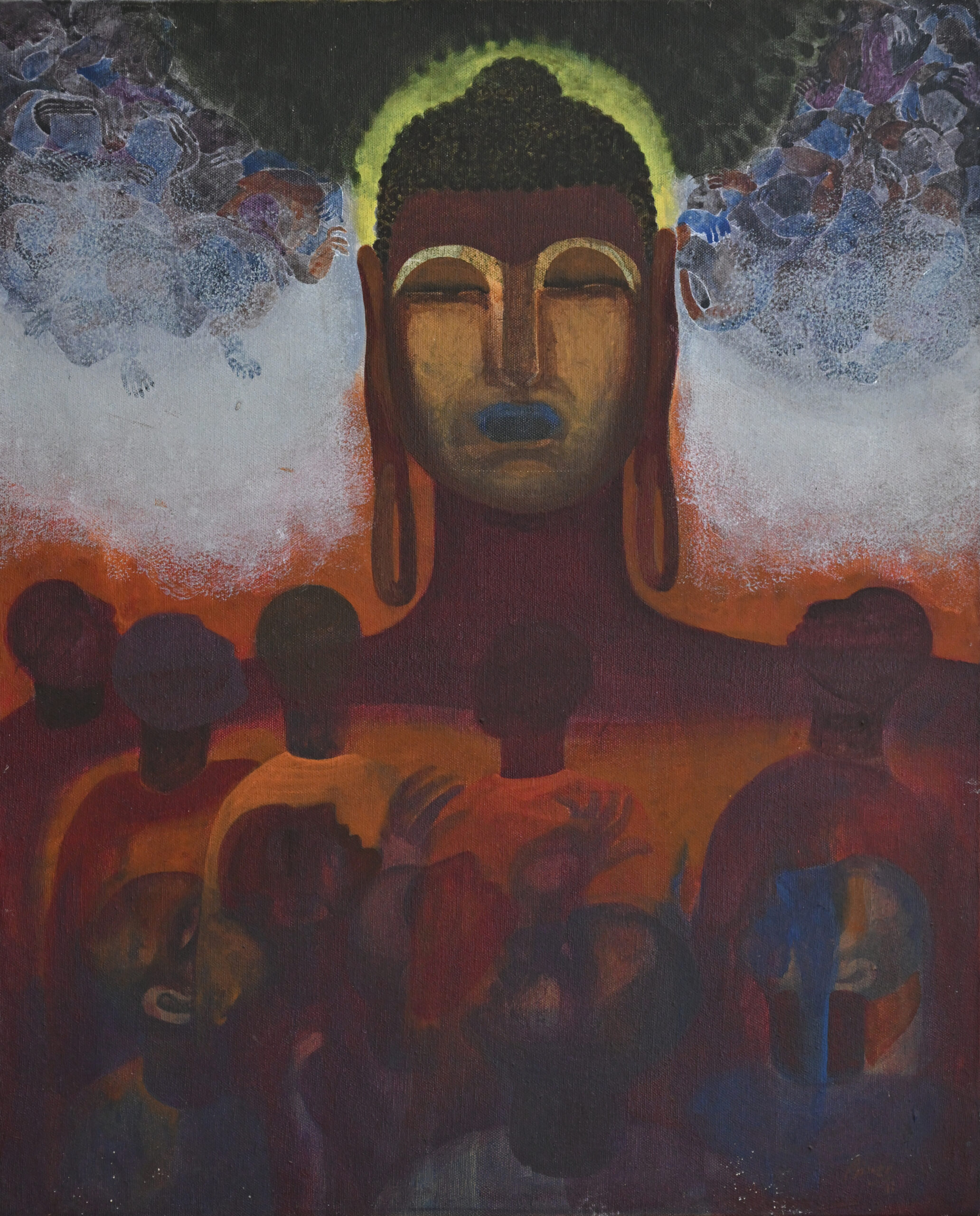 Buddha’s radiant halo glows like a sun of silence, casting warmth over shadowed figures in reverent pose. His closed eyes and blue lips speak of inner stillness, while the surrounding forms reach upward—echoes of longing and devotion. Above, abstract clouds swirl in blue and purple, bridging the divine and the earthly in quiet motion. Bireshwar Bhattacharya’s canvas becomes a spiritual threshold, where enlightenment touches the many through one serene gaze.