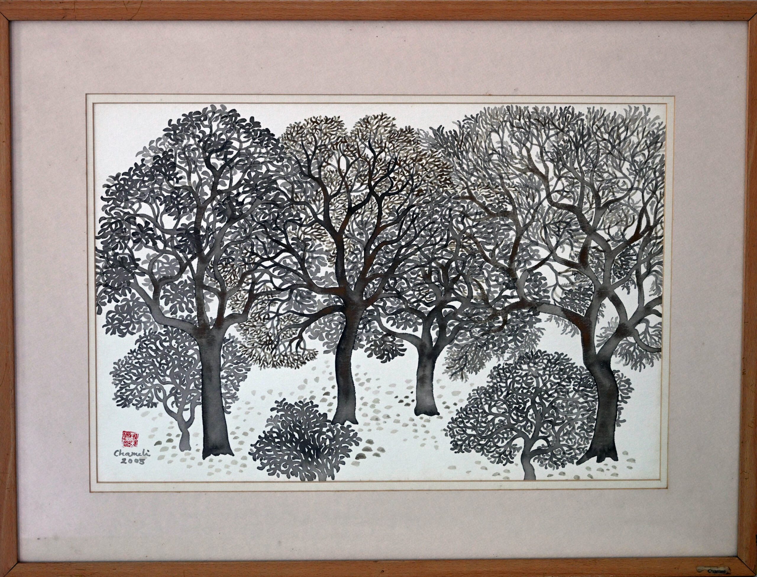Chameli Ramachandran’s forest artwork evokes a meditative stillness, where nature breathes in monochrome whispers. Delicate trees stretch upward in lyrical rhythm, their foliage etched with fine, almost calligraphic detail that recalls Chinese ink traditions. The muted palette of blacks and grays invites introspection, allowing texture and form to speak with quiet intensity. Signed and sealed…