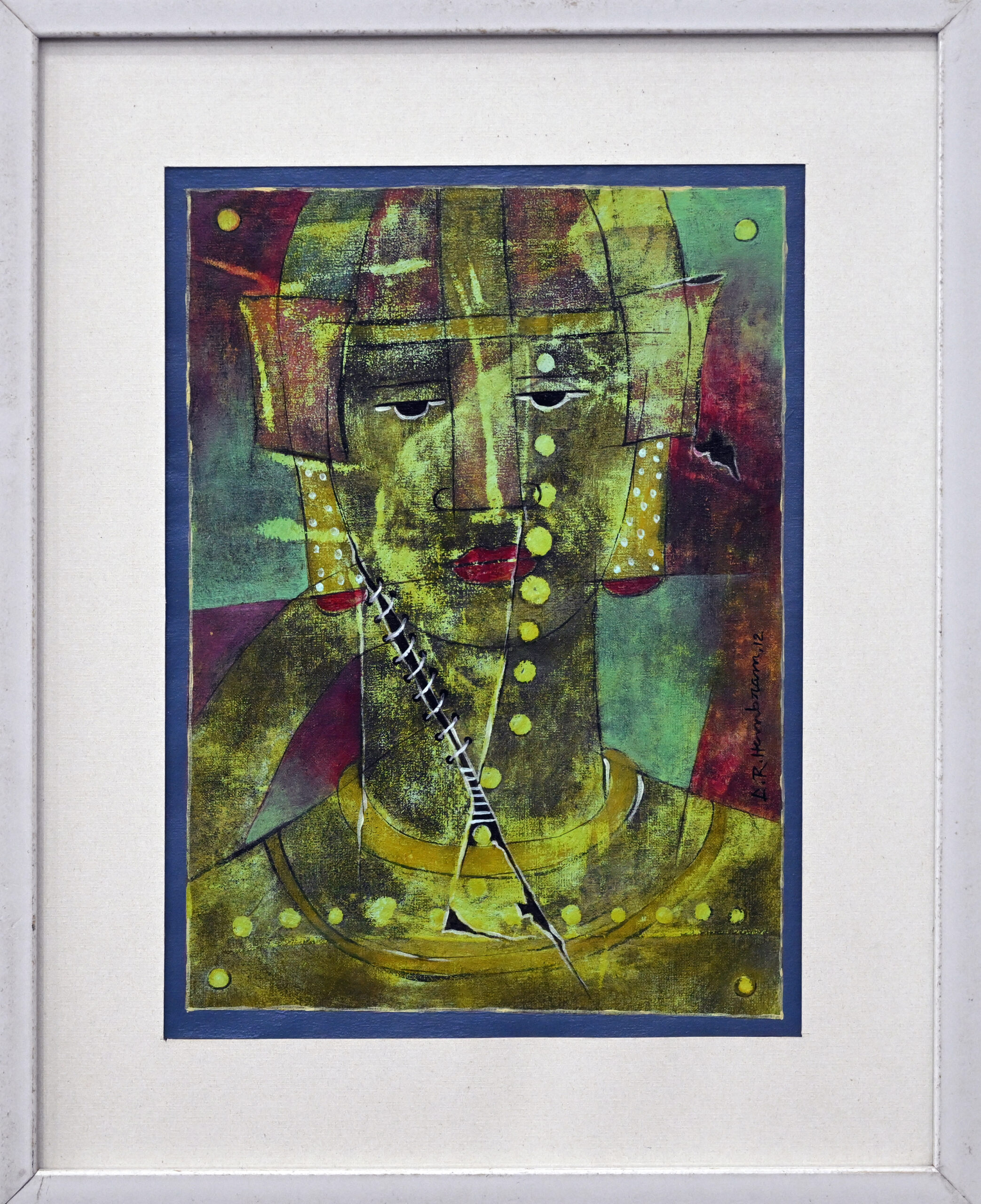 This artwork by C.R. Hembram is a striking fusion of tribal identity and modern abstraction, rooted in Santal heritage. A stylized face emerges in geometric layers—elongated, adorned, and marked with dotted lines that echo ritual and memory. The palette of green, red, yellow, and black pulses with earthy symbolism, while circular motifs and helmet-like headgear suggest protection, ancestry, and cosmic connection. Hembram’s brush transforms portraiture into cultural storytelling, where every contour honors the resilience and rhythm of Santal life.