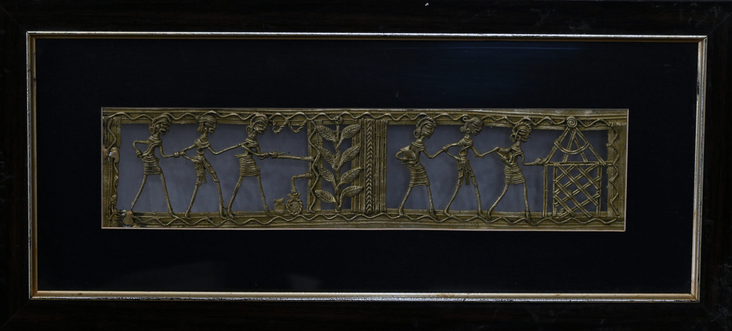 Golden figures dance across a dark canvas, their movements etched in ritual and rhythm. Each form glows with ancestral energy, framed by geometric patterns and a hut-like structure that hints at sacred gathering. The horizontal flow evokes continuity—like a story passed from hand to hand, generation to generation. This artwork is a luminous procession, where tradition marches in metallic grace.