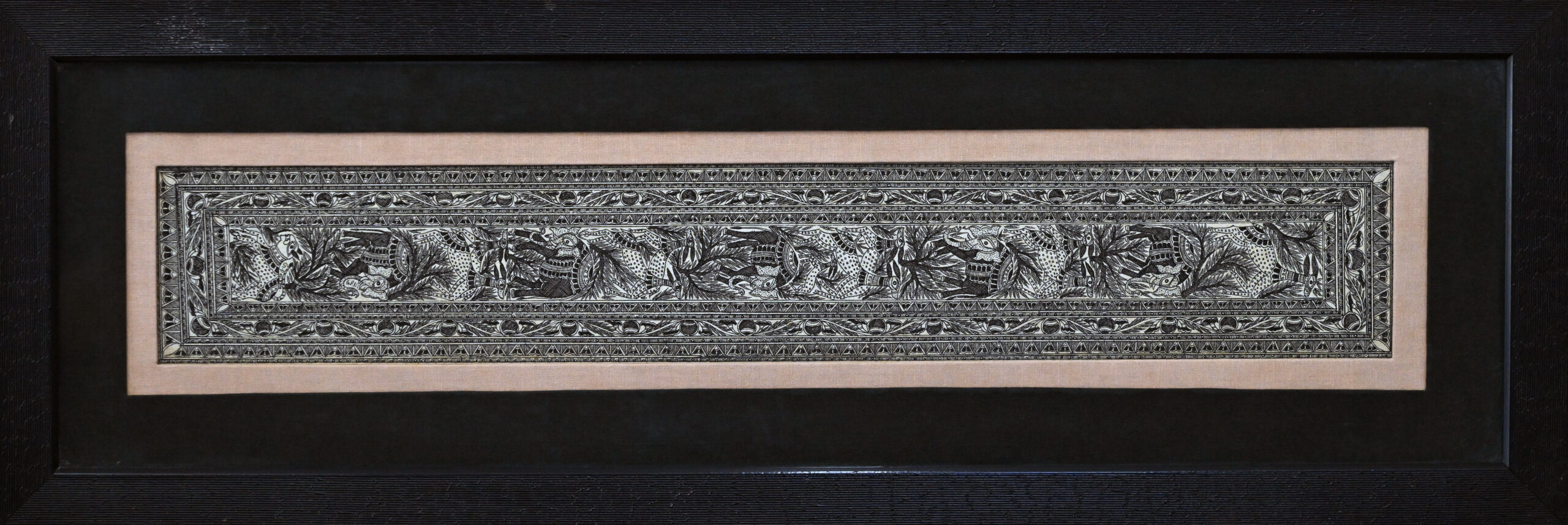 G.P. Nirala’s engraving unfolds like a mythic scroll, where human and animal forms weave a continuous tale. Each figure is etched with reverent detail, evoking ancient narratives and cultural memory through monochrome precision. The horizontal flow suggests movement across time—ritual, conflict, and communion rendered in rhythmic linework. It is a visual epic, where tradition breathes…