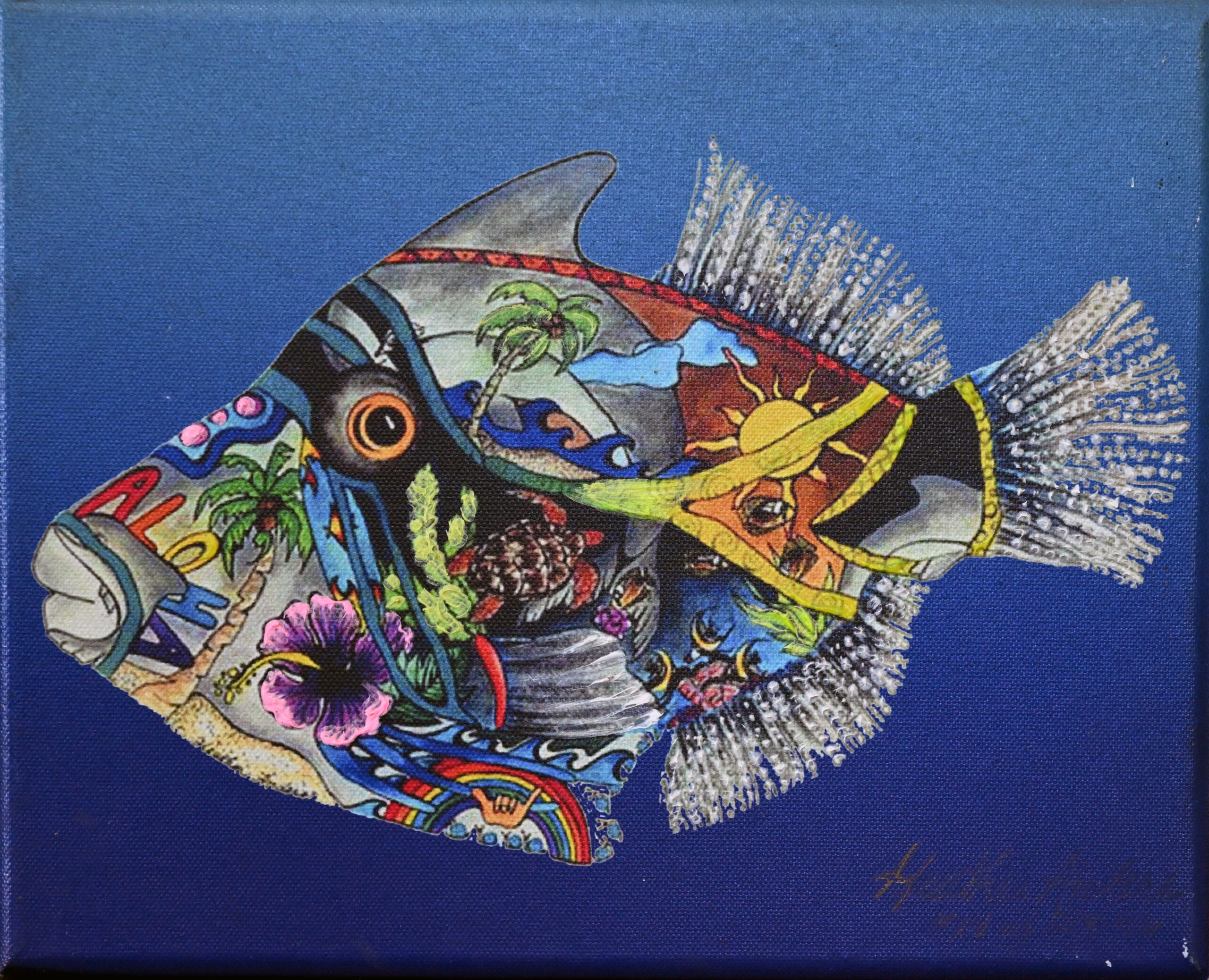 A fish swims through deep blue stillness, its body blooming with sun, sea, mountains, and tropical life. Each element—palm trees, birds, waves—becomes a memory stitched into scales, turning nature into a living mosaic. The white-lined fins ripple like whispers of motion, balancing intricate detail with graceful simplicity. It is a celebration of interconnected worlds, where…