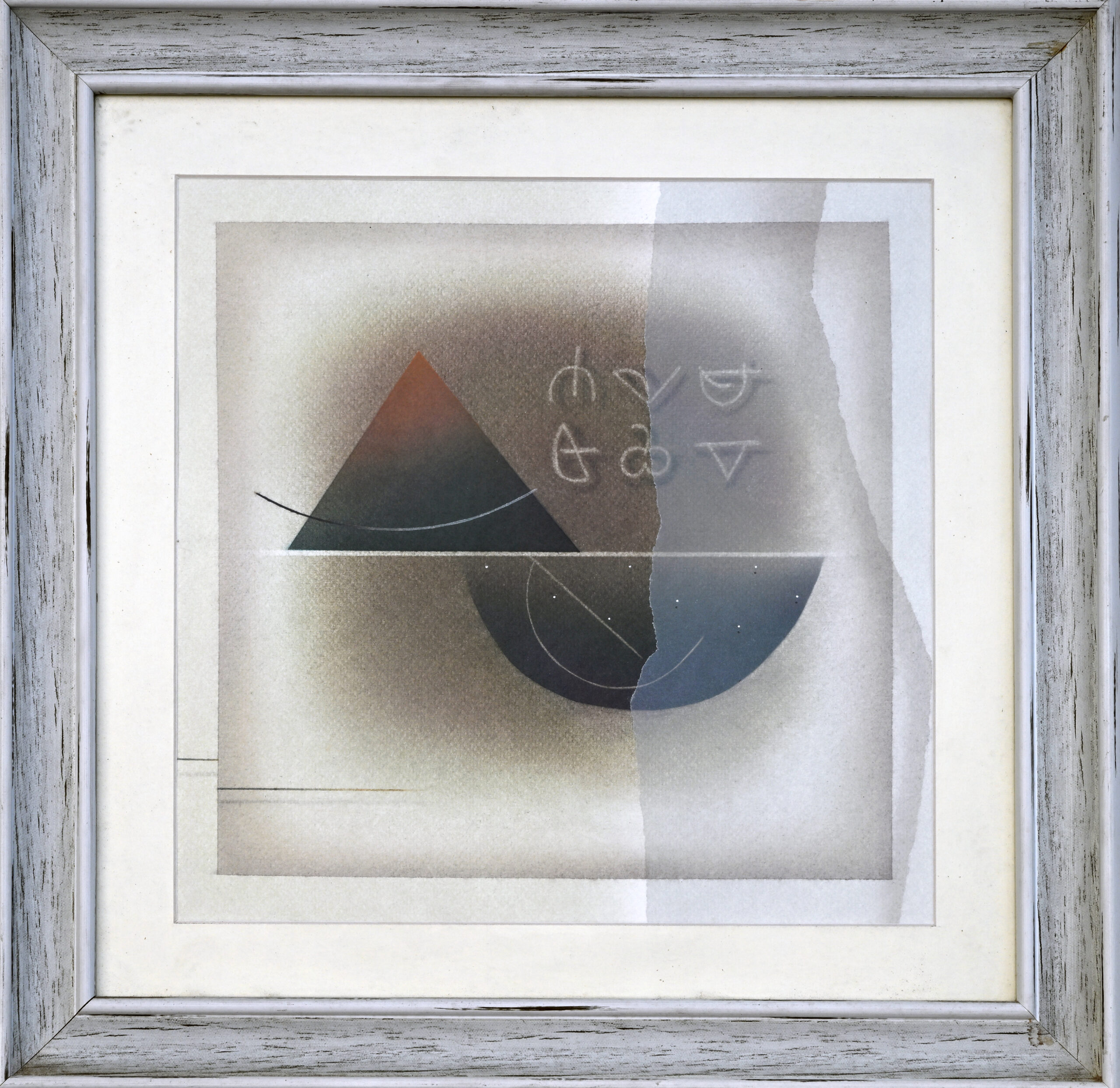 A black triangle and semicircle meet at a quiet horizon, their union pierced by a line of mystery. Above them, five cryptic symbols hover like forgotten chants—echoes of a language felt, not spoken. Hemant Rao bathes the scene in muted gradients, where geometry becomes breath and abstraction becomes ritual. It is a visual invocation, balancing form and silence in sacred symmetry.
