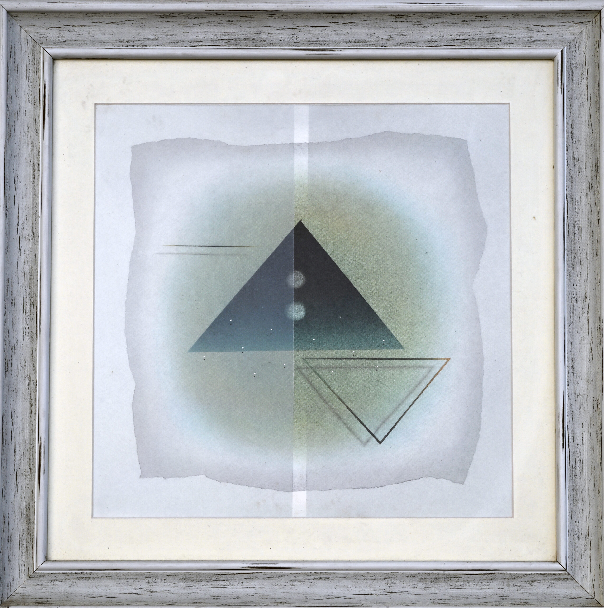 A black triangle anchors the center like a silent mountain, its core pierced by three vertical orbs—each a breath of balance. Beneath it, two outlined triangles—one red, one black—echo layers of memory and duality. Hemant Rao surrounds this geometry with a soft halo and a dividing white line, evoking symmetry as a spiritual axis. It is a quiet ritual in form, where abstraction becomes invocation and stillness becomes symbol.