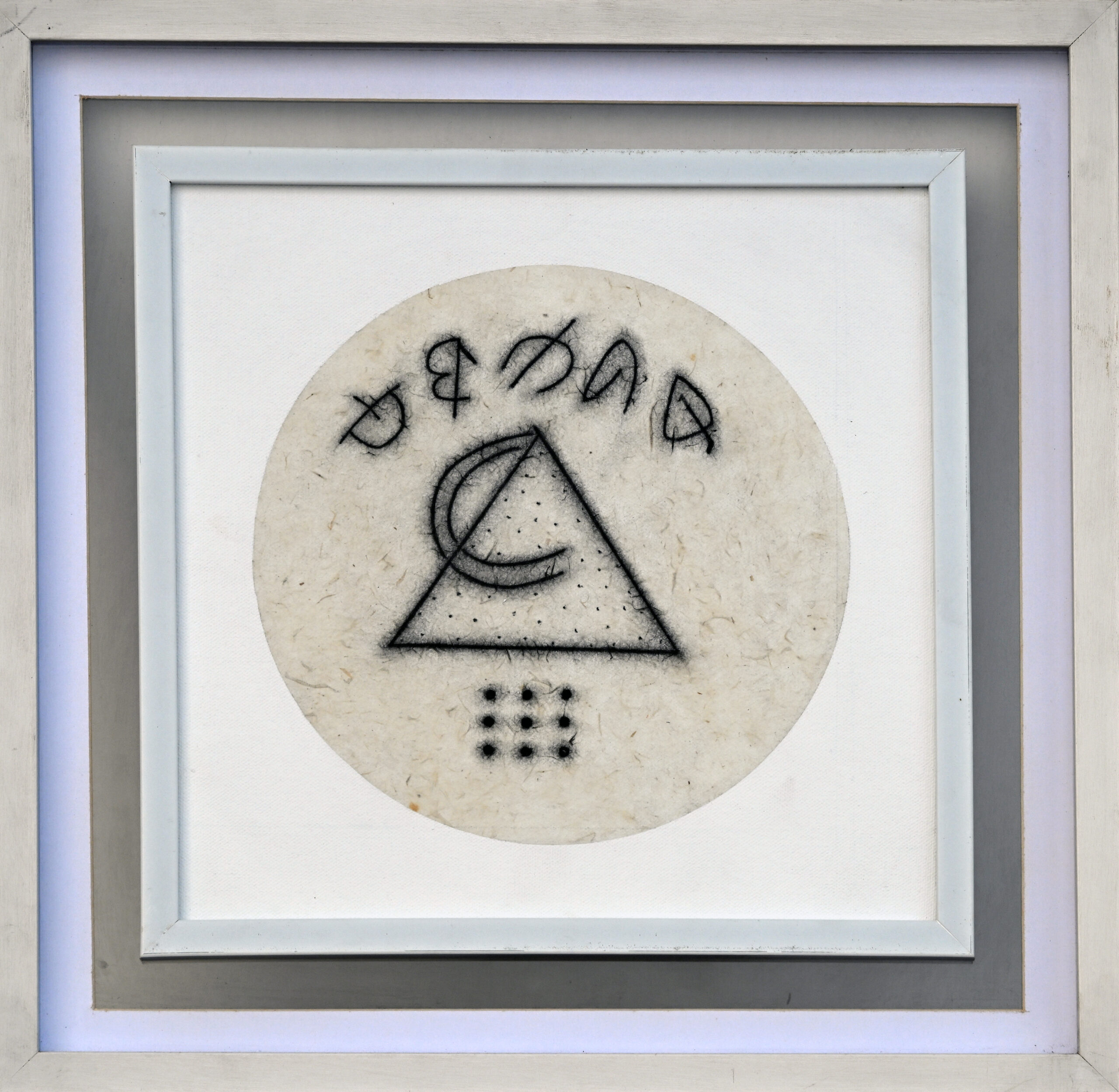 A black triangle and crescent float within a circle like celestial glyphs, poised between mystery and meaning. Beneath them, a grid of nine dots anchors the composition—order within abstraction, ritual within silence. Stylized symbols hover above like forgotten scripts, hinting at a language of intuition and form. Hemant Rao distills geometry into meditation, crafting a…