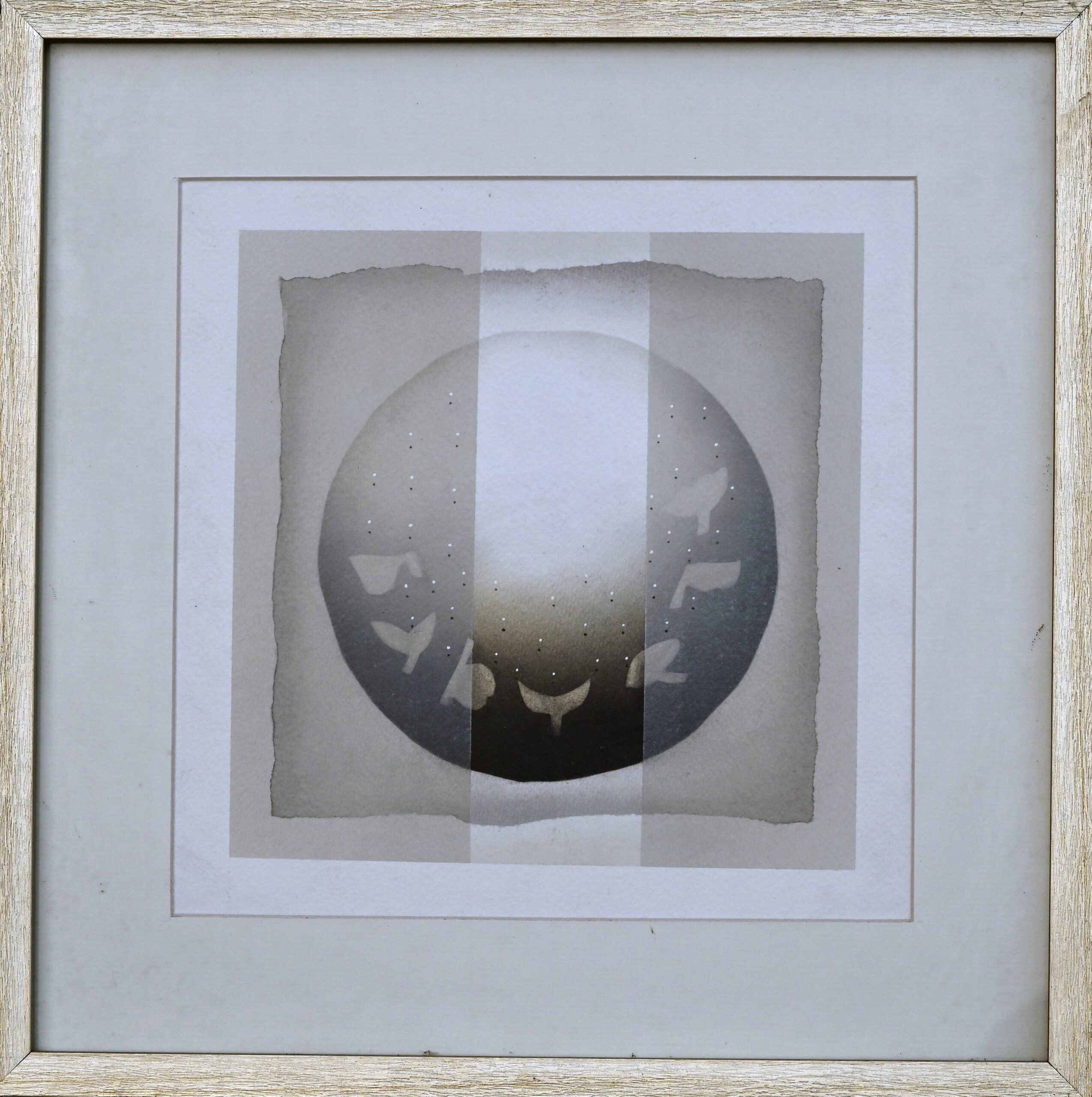 A celestial disc floats at the center, its gradient glow cradling silhouettes that resemble birds or whale tails in flight. Hemant Rao layers torn textures and vertical bands like veils of memory, soft yet deliberate. The composition hums with quiet tension—where symmetry meets mystery, and abstraction becomes ritual. It is a meditation in form, a…