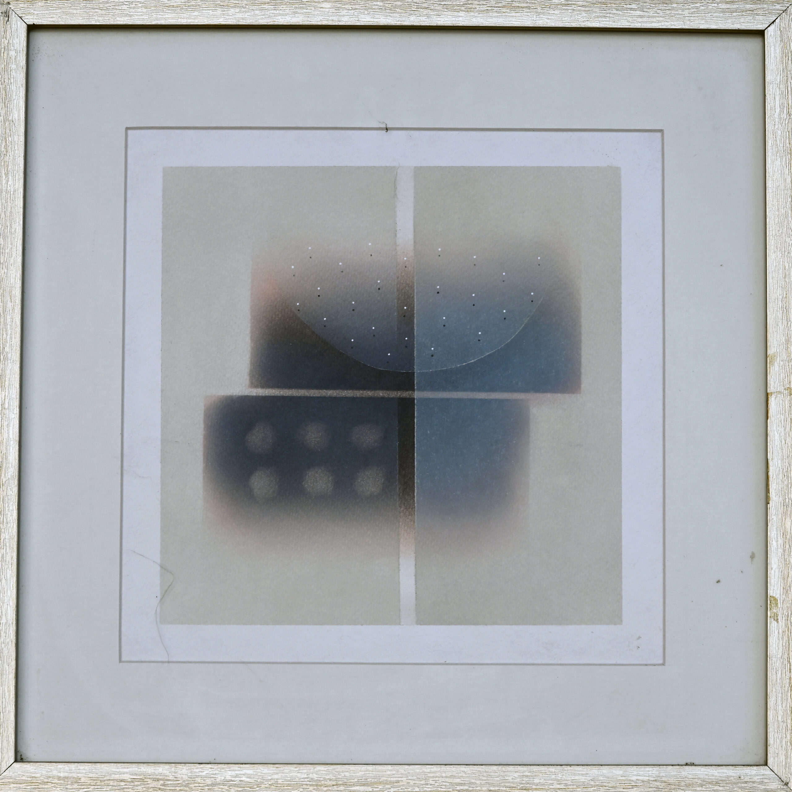 Hemant Rao’s minimalist geometry breathes like quiet wind across a divided field of soft gradients. Each quadrant holds a whisper—dots, curves, and muted tones that evoke cosmic rhythm and meditative balance. The intersecting white lines form a cross not of division, but of convergence, where abstraction meets serenity. It is a visual mantra, inviting stillness…