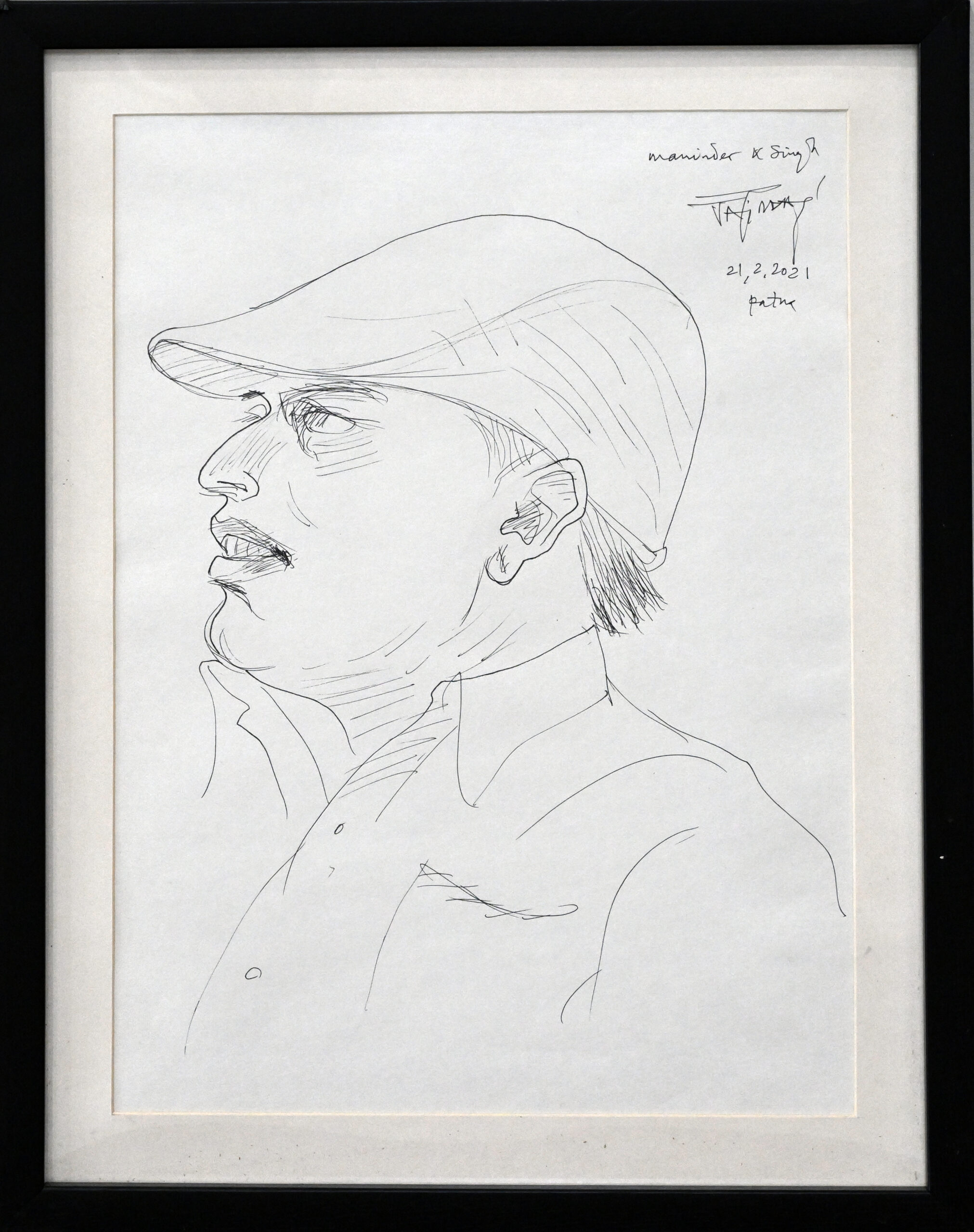 A profile sketch captures quiet strength, the figure’s gaze steady beneath a flat cap and subtle shading. Minimal lines evoke depth and dignity, while the earring and collared shirt hint at individuality within simplicity. The handwritten note anchors the moment in time—Patna, 2001—turning portrait into memory. Jatin Das’s line becomes a gesture of presence, where contemporary spirit meets timeless introspection.