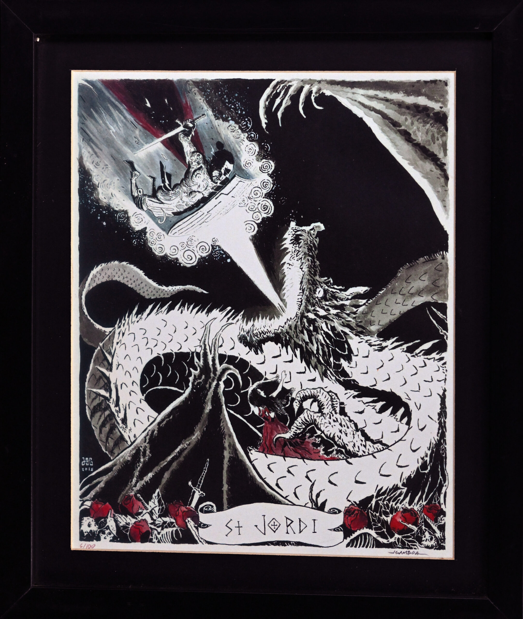 A knight stands triumphant atop a slain dragon, its blood pooling among roses and skulls like sacred sacrifice. A beam of divine light pierces the sky, revealing a ship within—a celestial witness to earthly valor. The stark palette of black, white, and red intensifies the mythic drama, where death and deliverance entwine. J. G. Amboa’s…