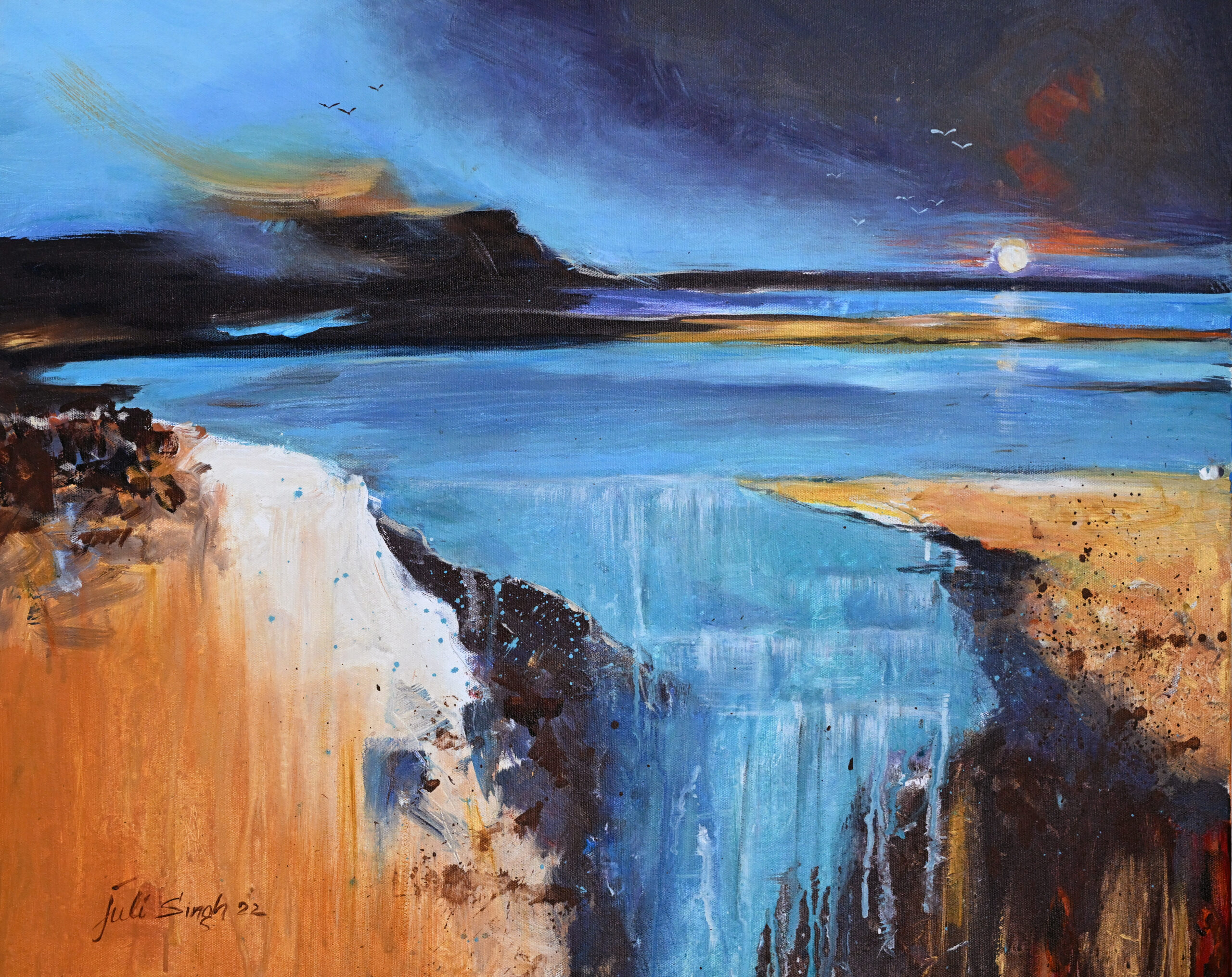 A waterfall spills into still waters, its descent a luminous thread between fiery earth and indigo sky. Birds glide through the dusk, while cliffs and reflections cradle the scene in quiet majesty. The colors clash and harmonize—orange, blue, white—like emotions meeting at the edge of memory. Juli Singh’s landscape pulses with elemental rhythm, where nature’s drama becomes a mirror of inner stillness.